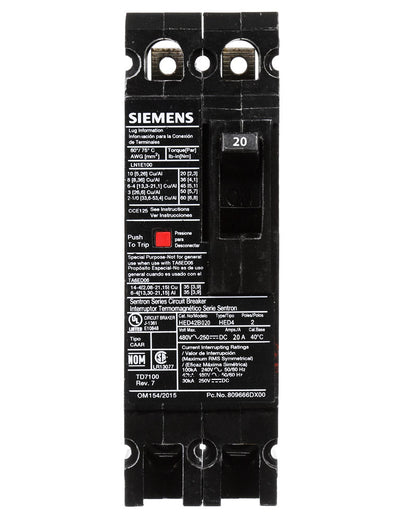 HED42B030L - Siemens 30 Amp 2 Pole 480 Volt Feed Thru Molded Case Circuit Breaker