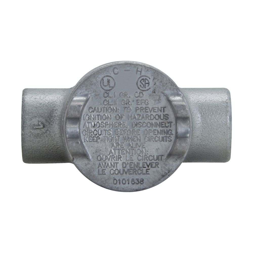 Eaton Crouse-Hinds series Condulet GUA conduit outlet box with cover, 2" cover opening diameter, Copper-free aluminum, C shape, 1/2"