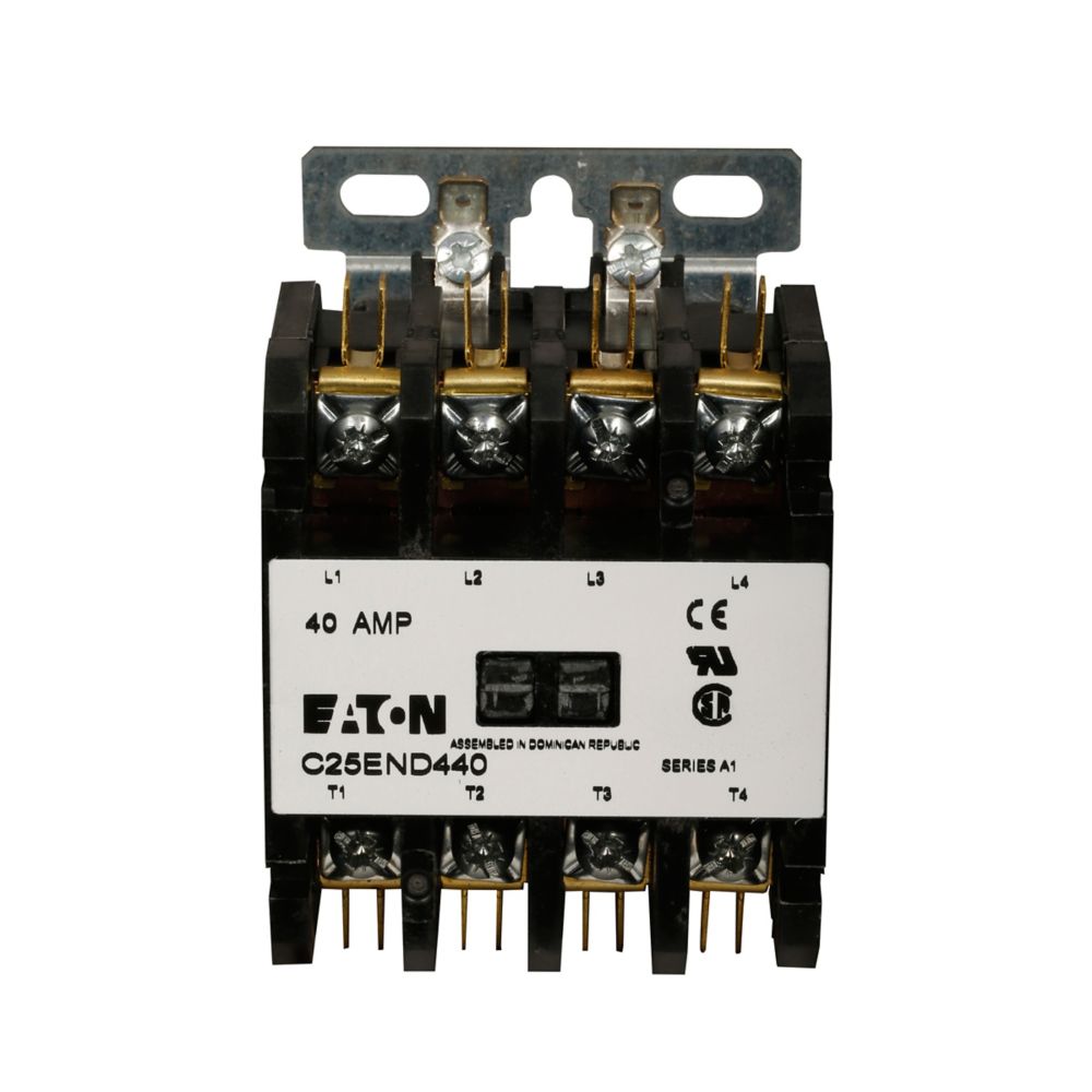 Eaton definite purpose contactor, Quick, 40A, 24 Vac, 50/60 Hz, Open with metal mounting plate, 15-50A, two- and three-pole,40A,Contactor,Four-pole,50A, Box lugs (posidrive setscrew) and quick connect terminals (side-by-side), Non-reversing