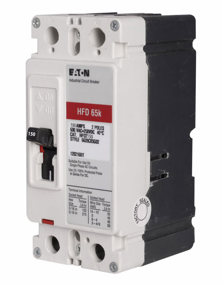 Eaton Cutler Hammer, Series C, type HFD, 2P, 1PH, 150A, 600V, 65kA@480V, high interrupting capacity, 40Cb bolt-on LI - Long-Time and Instantaneous trip functions and load side lug terminals thermal magnetic molded case circuit breaker