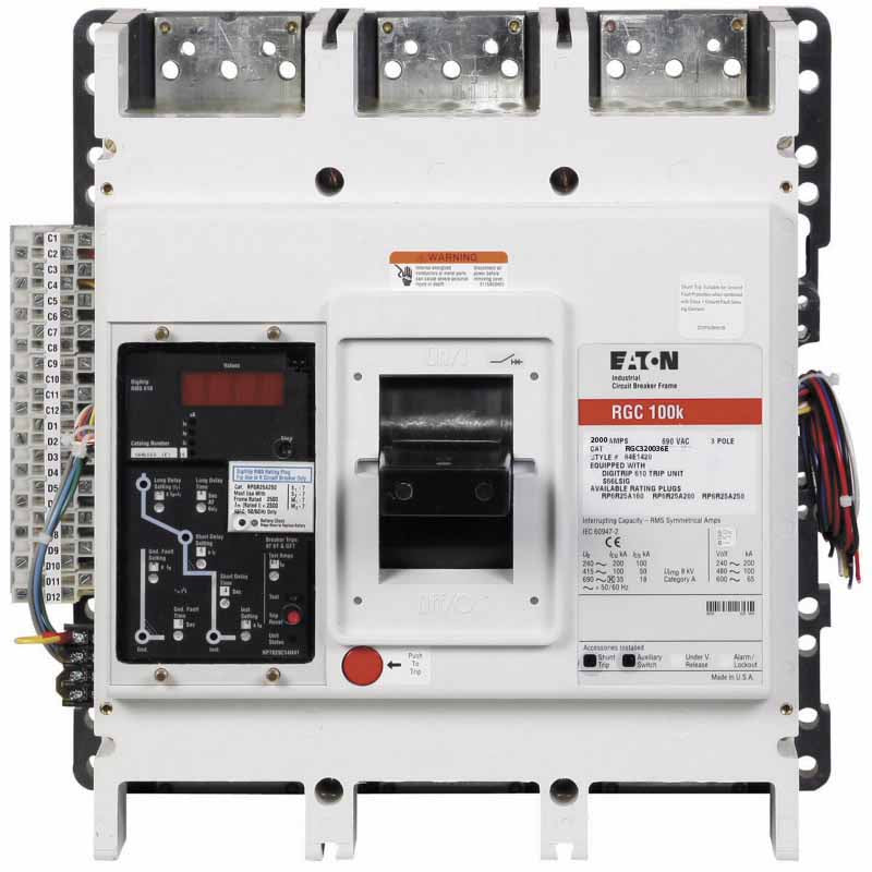 Eaton Series G electronic molded case circuit breaker, RG-frame, RG, Digitrip 310 RMS, Electronic LSIG trip, Three-pole, 2000A, 600 Vac, 200kA@240 Vac, 100kA@480 Vac, Line and load, Imperial, 50/60 Hz, 80% rated.