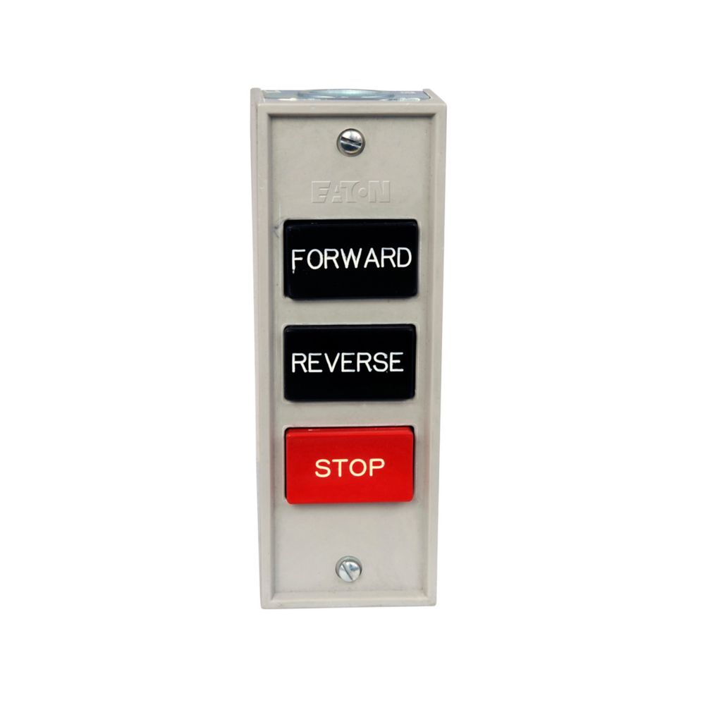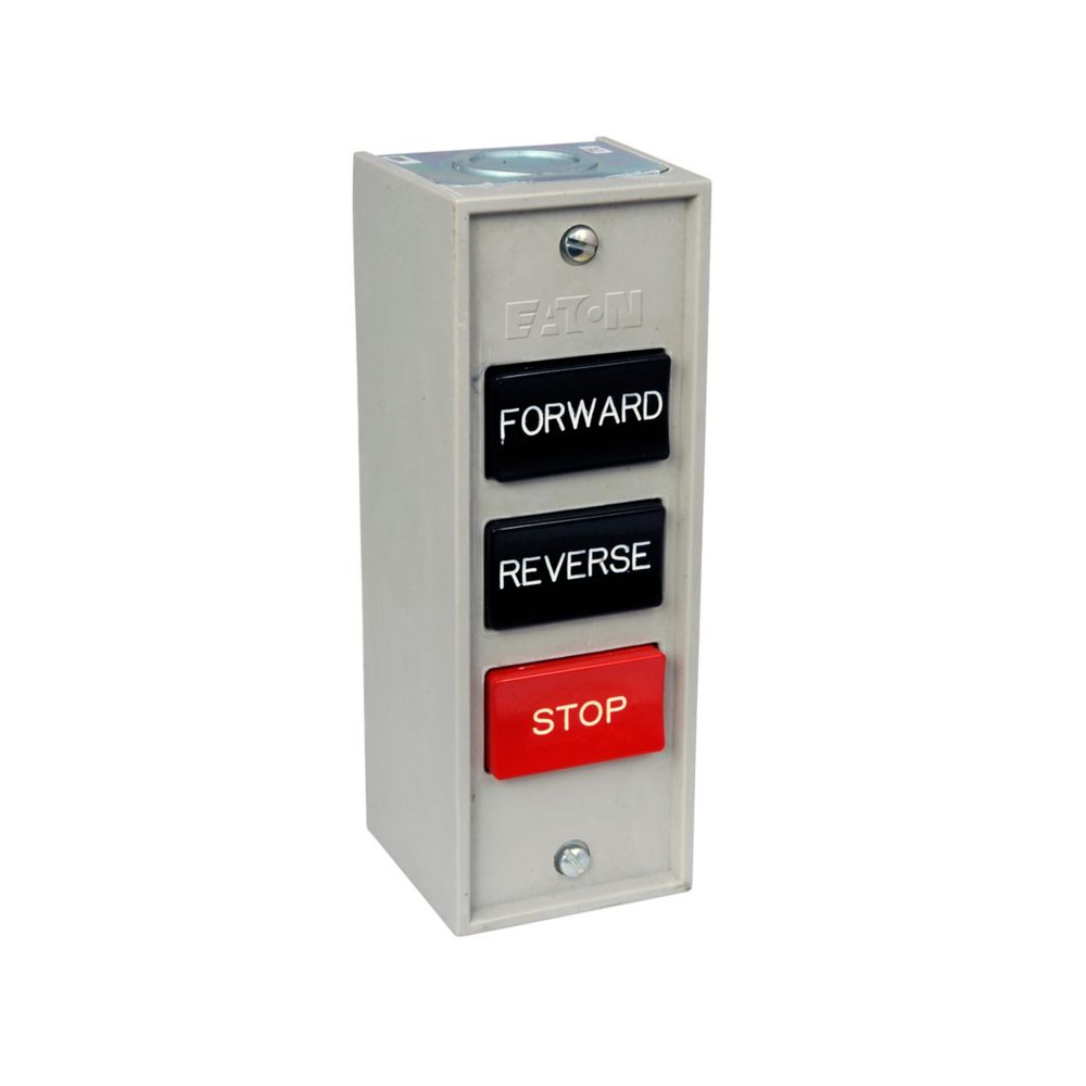 Eaton 10250T pushbutton,10250H, Assembled control station, 30.5 mm, Heavy-Duty, NEMA 1, Black, Flush, Die cast, FOR/REV/STOP, Surface, Three element