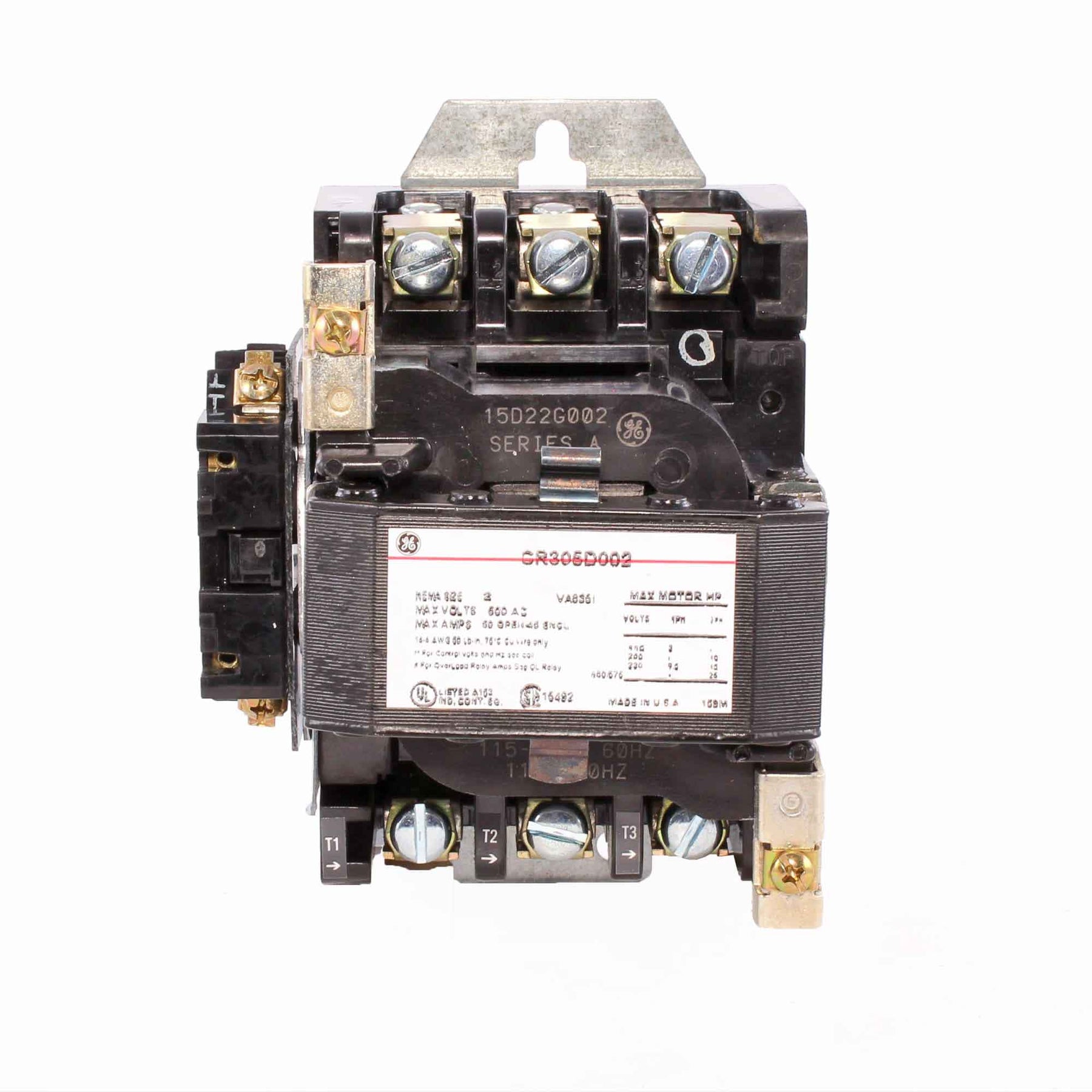 CR305D002 - A non-reversing open type magnetic contactor from General Electric's 300-Line series (Type CR305D). It is 3P, 3PH, 50A, 600V, with a 115V-120V 60Hz AC coil. It is NEMA size 2 and suitable for use with 300-Line motor control systems.