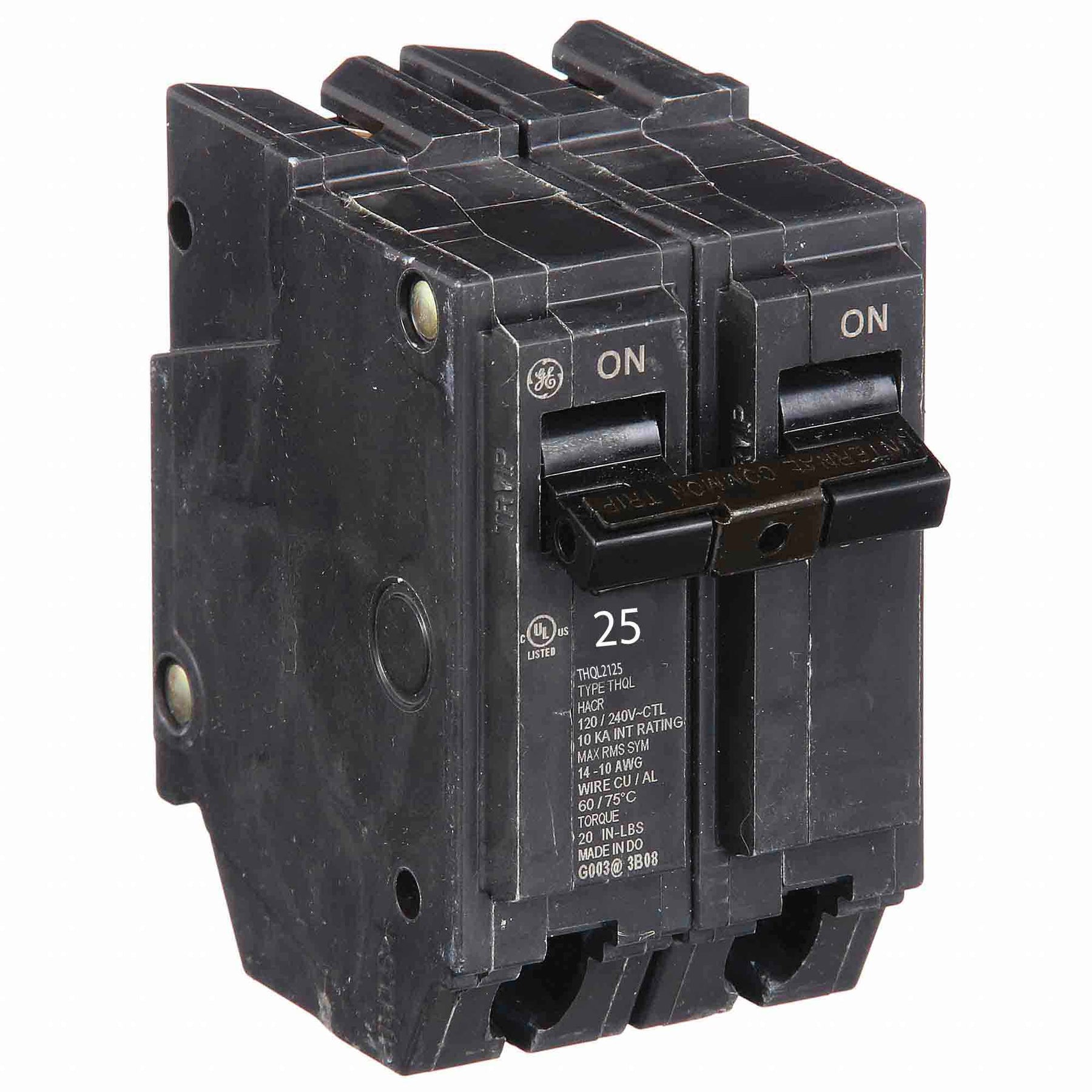 Manufacturer THQL2125, Brand: General Electric, Product Type: THQL Circuit Breaker, Model: THQL, Configuration: 2P, 1PH, Amperage: 25A, Voltage: 240V, Interrupting Capacity: 10kA@120V, Features: UL listed, Plug-In, Complete with LI - Long-Time and Instantaneous trip functions, and load side lug terminal. Technology: Thermal Magnetic, Design: Molded Case Circuit Breaker.