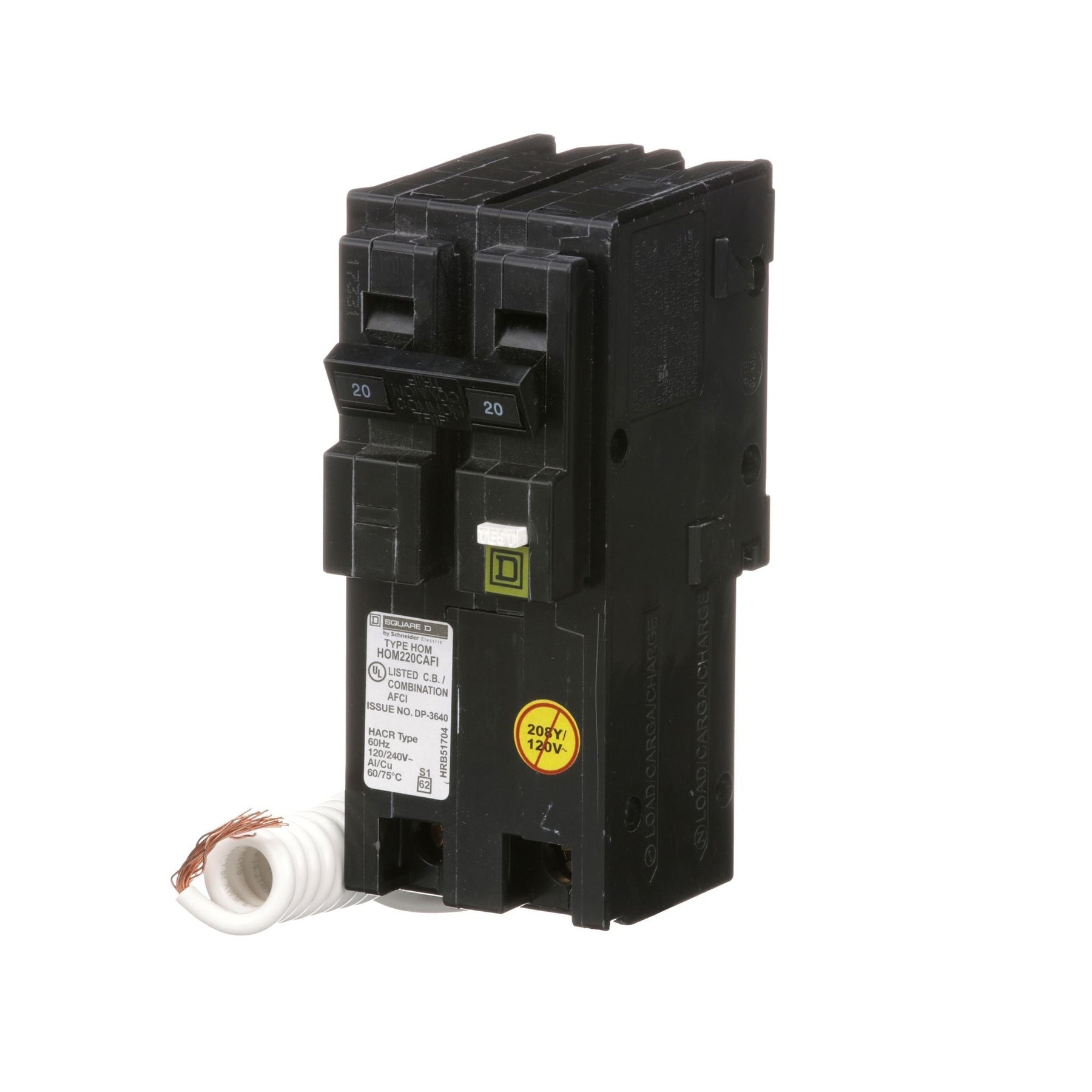 Homeline miniature circuit breakers are engineered and designed for fast installation and superior circuit protection. Homeline circuit breakers are designed to plug into Homeline load centers to provide circuit protection. This circuit breaker provides standard circuit protection and is HACR rated. This 2 pole circuit breaker with plug in mounting is rated 20A at 120/240 VAC. HOM breakers provide 10 kA breaking capacity. Homeline combination arc fault circuit interrupters provide overload and short circuit protection, plus arc fault protection in accordance with the NEC and UL1699. This breaker has a pigtail neutral. The electrical connection is a clamp terminal that will accept 2 wires. The clamp terminal will accept a wire range of 14 AWG to 8 AWG copper or aluminum wire. This circuit breaker has a height of 3.13 inches, a width of 2.0 inch and depth of 2.98 inches. HOM Homeline miniature circuit breakers are UL Listed.