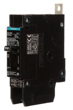 Siemens single pole 50-ampere bolt-on molded case circuit breaker with maximum voltage rating of 277v and standard interrupting rating of 65 kiloampere at 120Vac Long-Time and Instantaneous trip functions.