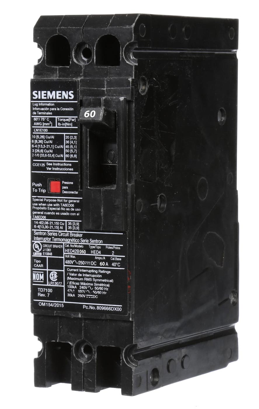 HED42B060 - Siemens 60 Amp 2 Pole 480 Volt Feed Thru Molded Case Circuit Breaker