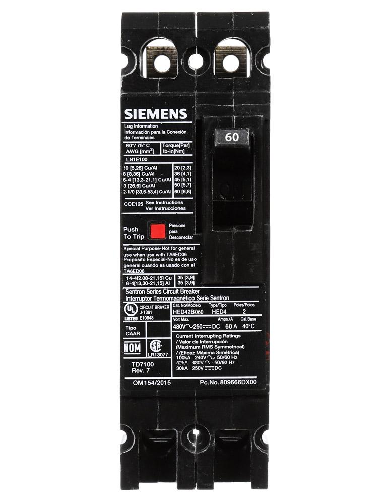 HED42B060L - Siemens 60 Amp 2 Pole 480 Volt Feed Thru Molded Case Circuit Breaker