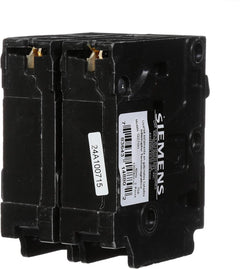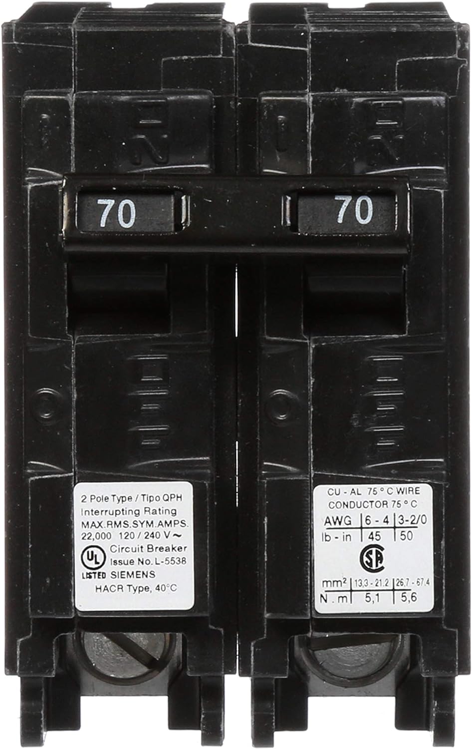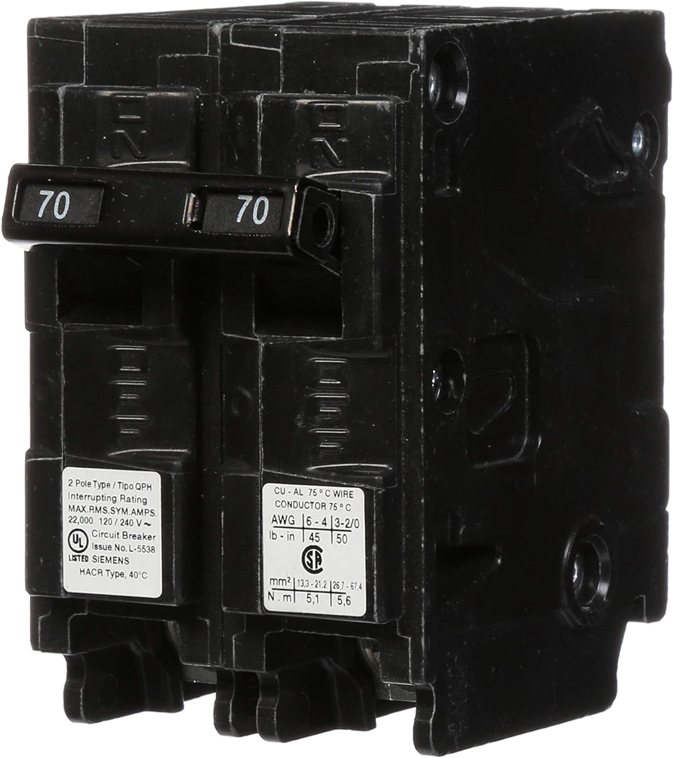 Siemens Q series double pole 70 ampere plug-in molded case circuit breaker with maximum voltage rating of 240V tripping method thermal magnetic and standard interrupting rating of 22 kiloampere at 240V complete with non-interchangeable trip (LI) long-time and instantaneous trip functions.