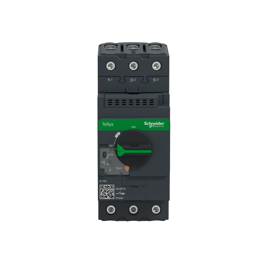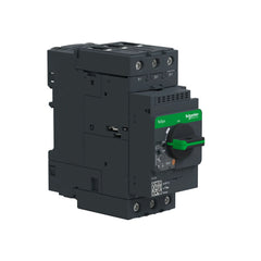 GV3P18 is a TeSys GV motor circuit breaker from Schneider Electric. It ensures thermal-magnetic protection for motors 7.5kW@400V and high breaking capacity Icu 100kA. Start-stop control by rotary knob guaranteed for 50 000 cycles AC-3 415V. GV3P18 is a TeSys GV motor circuit breaker from Schneider Electric designed for motor applications 7.5kW@400V. It fulfills a thermal-magnetic protection with a thermal setting range 12-18A, magnetic tripping at 14xIn and high breaking capacity Icu 100kA@400V. Start-stop control by rotary knob guaranteed for 50 000 cycles AC-3 415V. Available worldwide, it is multi-standards certified (IEC, UL, CSA, CCC, EAC, Marine) and Green Premium compliant (RoHs/Reach). Complete motor protection in a single device , short-circuit, overload, disconnection. Associated with a TeSys contactor, it ensures a complete type 1 or type 2 Motor Starter solution. Compact, 55mm wide, for DIN-rail and panel mounting. Manual control with rotary knob for Start / Stop, padlockable. Possible mounting of auxiliary contacts front or side mounted (GVAE, GVAN, GVAD) for status and tripping signaling. For large industrial or building LV distribution networks thanks to a high 100kA breaking capacity. Power connections with EverLink BTR screw connectors providing constant tightening pressure. Can be associated with undervoltage or shunt tripping units (GVAU, GVAS) and power distribution busbars (GV3G).