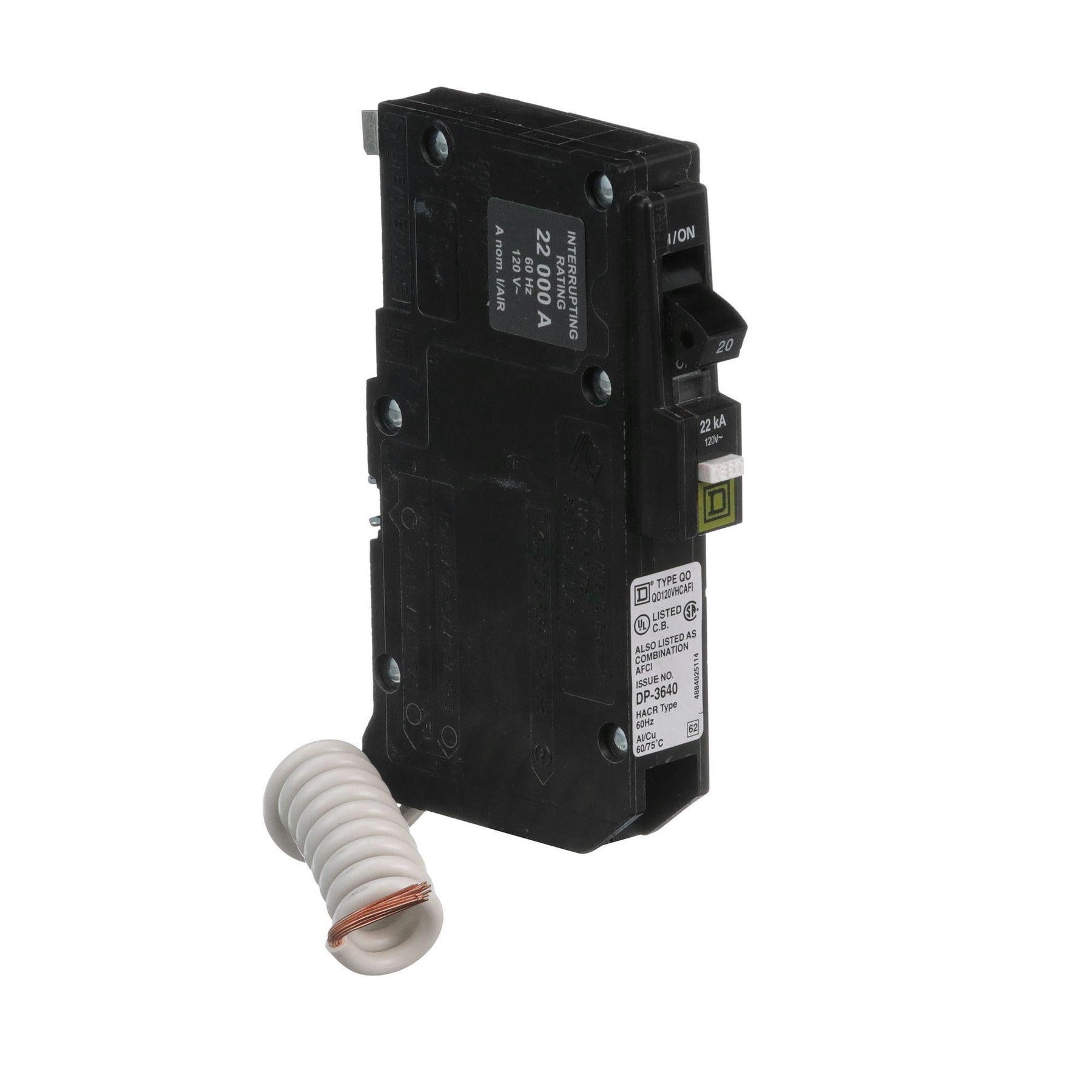 QO and QOB one, two and three pole thermal magnetic circuit breakers provide overcurrent protection and switching on ac and dc systems. These circuit breakers have an over center, trip free toggle mechanism with quick make, quick break action and positive handle indication. They also have VisiTrip trip indication, which provides a visual indication that the circuit breaker has tripped and interrupted the circuit. A full line of features and factory installed accessories are also available such as shunt trips, auxiliary switches and alarm switches. This 1 pole QO circuit breaker is rated at 20A at 120VAC. This unit provides 22kA breaking capacity and plug in mounting. This product includes a 6mA ground fault A with pigtail. This product includes a 6mA ground fault A with pigtail. QO circuit breakers are UL Listed under UL File E84967 and are CSA Certified under CSA Master Contract 153555.