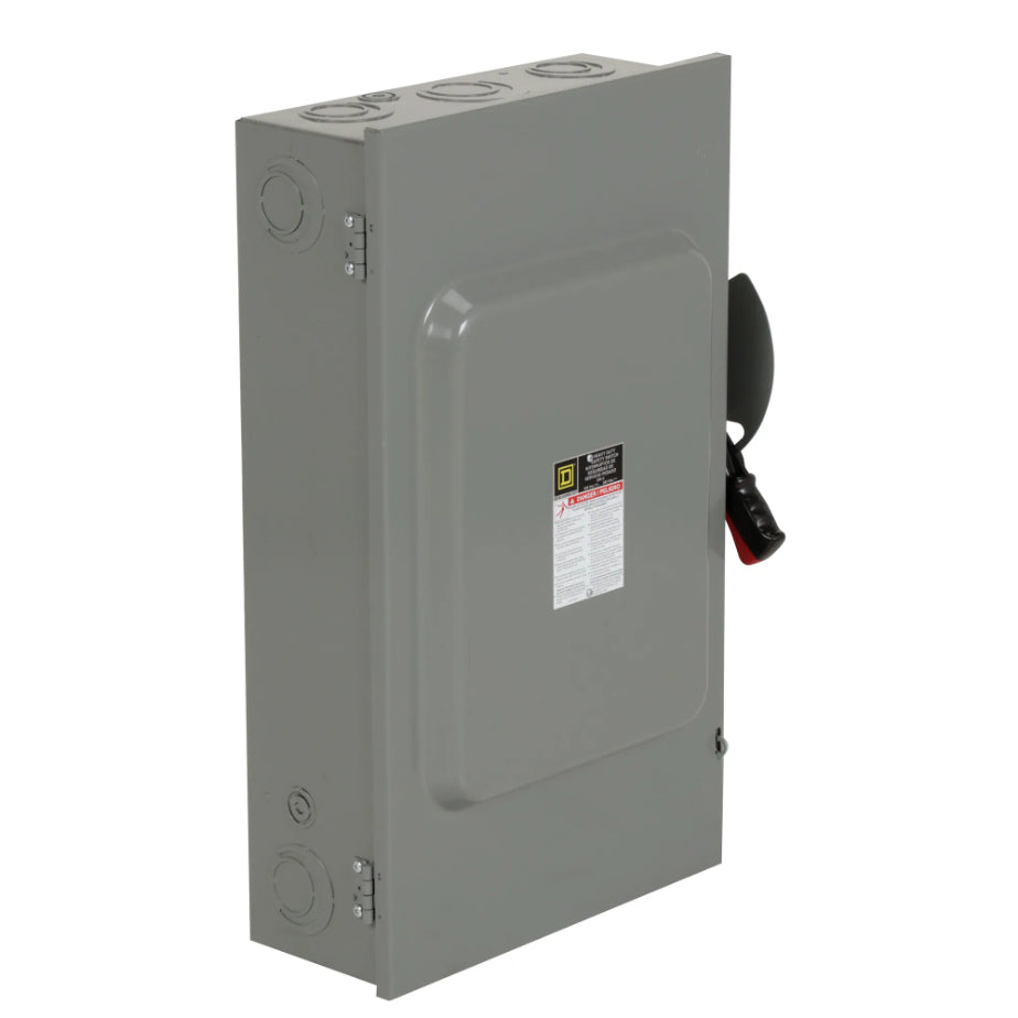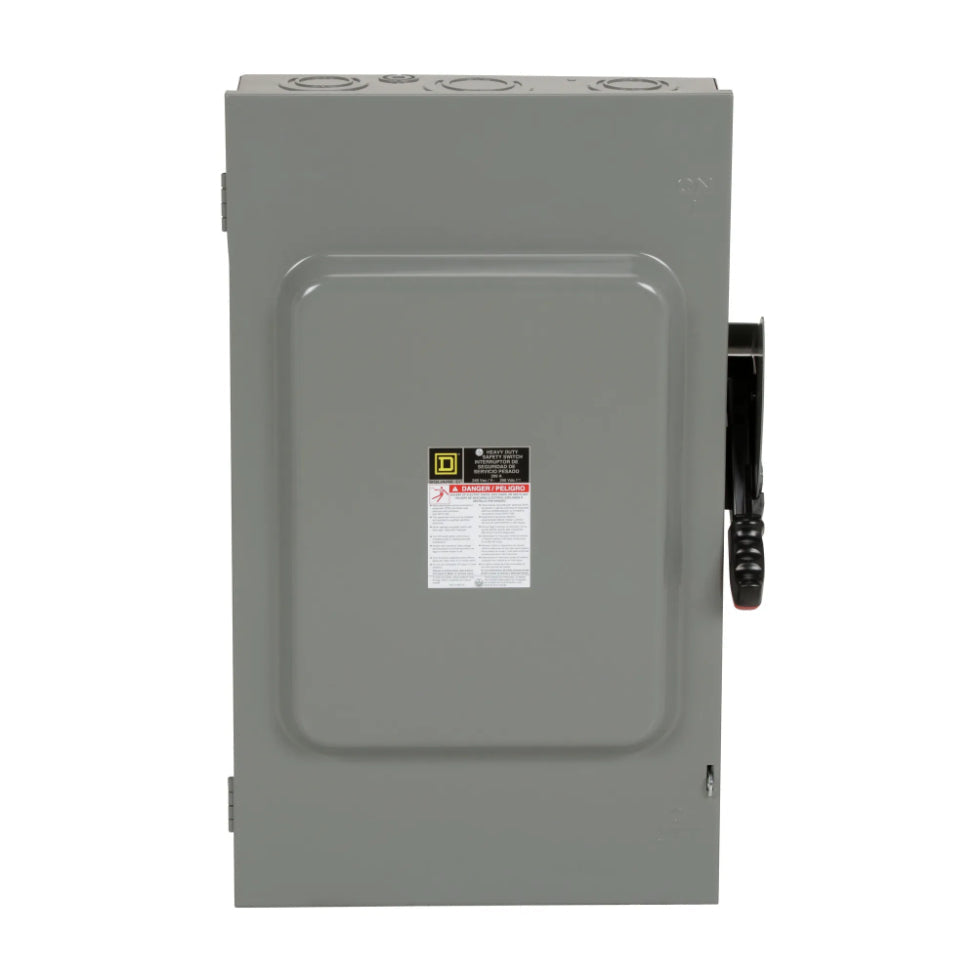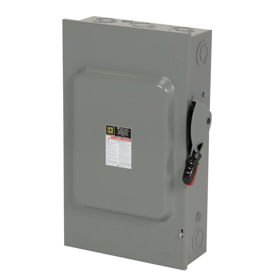 The Square Dâ„¢ by Schneider Electric brand Heavy Duty Safety Switch is designed to be tough, reliable and provide exceptional performance in the most grueling conditions. Heavy Duty Safety Switches are utilized from commercial and institutional to industrial and manufacturing facilities. F Series safety switches provide significantly higher levels of mechanical endurance than NEMA Type KS-1 or UL98 standards require. The design life of a F-Series switch is a minimum of three times the NEMA requirement. An abundance of copper is used in the heaviest current carrying power paths of all Square D by Schneider Electric Heavy Duty Safety Switches. The more copper for current carrying paths, the lower the temperature rise. Managing temperatures inside the switch is the key to providing greater service life. This heavy duty Single Throw Safety Switch has a rated current of 200A and has a NEMA 1 degree of protection. This fusible disconnect has a short circuit rating of 200kA@240VAC and has a neutral (factory installed). This safety switch has a steel enclosure and is surface mounted. This product is compatible with H or K, R, J or L fuses. The acceptable AWG gauge for this product is AWG 6 / 250 kcmil, copper or aluminum and has a tightening torque of 275-275 lbf in. This product complies to UL listed file E2875 standards and comes with an 18 month warranty. Dimensions for this product are 29 in (H), 17.13 in (W), 8.25 in (D).