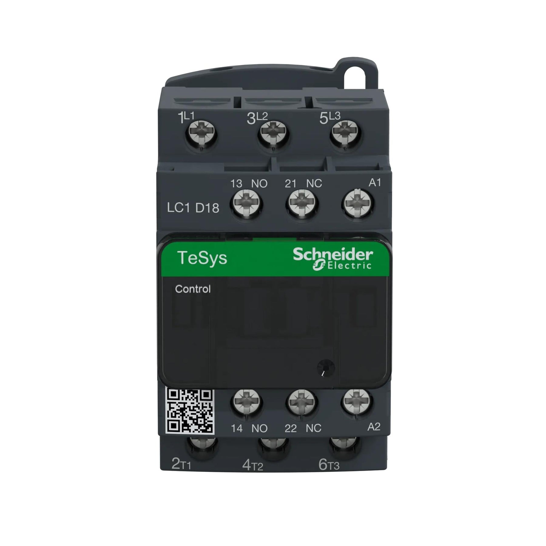 TeSys D contactors have been designed for perfect integration into control systems. They can be used to create motor starters for almost any type of application. TeSys D contactors are available in 13 contactor ratings for inductive motor applications up to 150 full-load amps and resistive loads up to 200 amps. This 18A inductive 3 pole IEC contactor can be mounted on DIN rail or mounted directly to a panel. Contactors have both Horsepower and Kw motor rating for international acceptance. Contactor is rated for 5HP at 200-208VAC, 5HP at 240VAC, 10HP at 480VAC and 15HP at 600VAC three phase. Contactor is also rated for 1HP at 115VAC and 3HP at 240VAC single phase. When used with a 480VAC up to 60A circuit breaker, this contactor can have a SCCR up to 85kA. When used with up to a 600VAC 40A Class J or CC fuse, this contactor can have a SCCR up to 100kA. Contactor is supplied with a 220 VAC 50/60 Hz coil. Contactor has one normally open and one normally closed auxiliary contact built-in as standard. The NC contact is mirror certified. Screw clamp terminals are used for load and auxiliary connections. An extensive line of accessories makes it easy to meet the requirements of most applications. The contactor is 3.03 inches tall, 1.77 inches wide and 3.39 inches deep. It weighs 0.73 lbs. Contactor is certified to UL, CSA, IEC, CCC, EAC and Marine standards. Contactor also meets the requirements of RoHS/REACh making it a Green Premium product.
