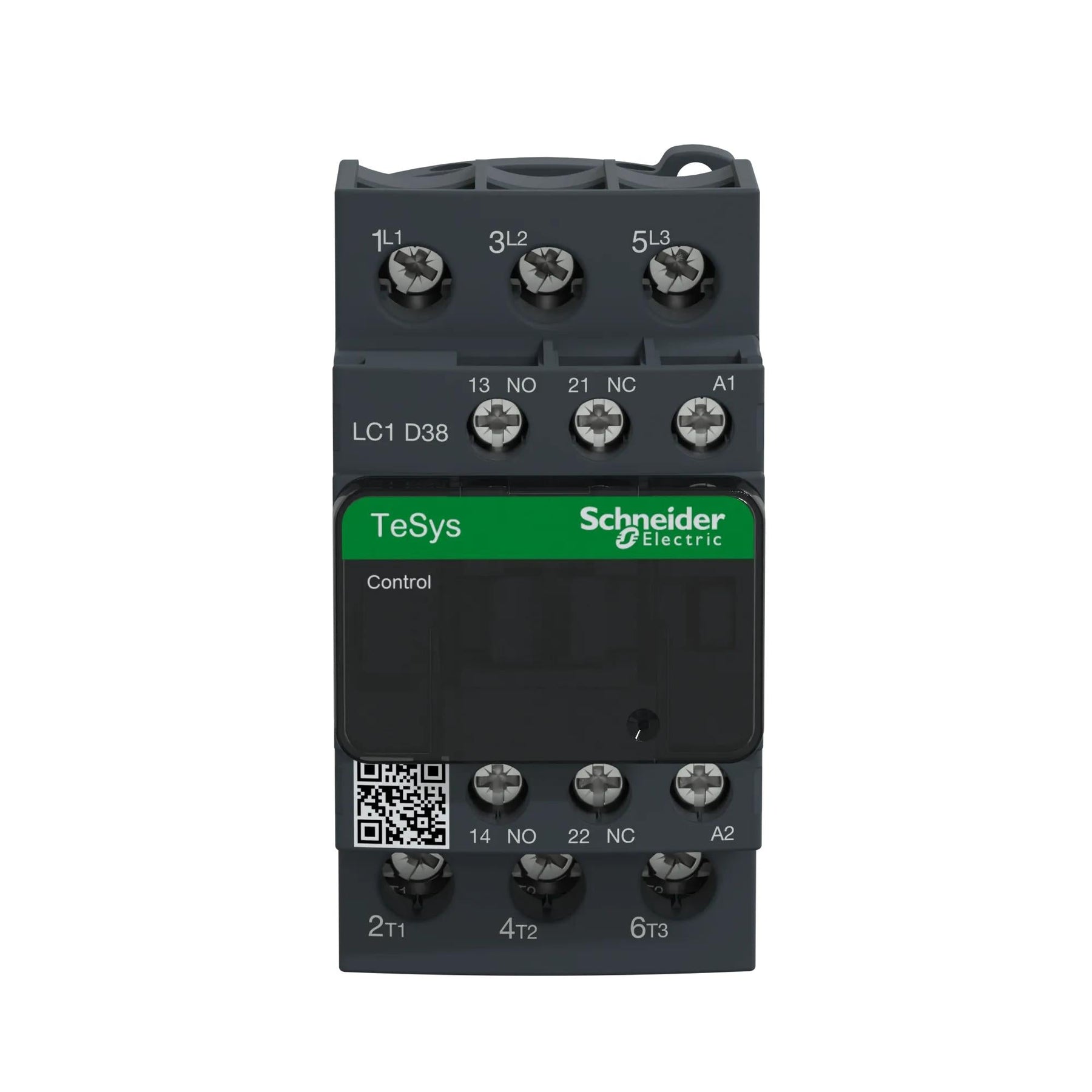 TeSys D contactors have been designed for perfect integration into control systems. They can be used to create motor starters for almost any type of application. TeSys D contactors are available in 13 contactor ratings for inductive motor applications up to 150 full-load amps and resistive loads up to 200 amps. This 38A inductive 3 pole IEC contactor can be mounted on DIN rail or mounted directly to a panel. Contactors have both Horsepower and Kw motor rating for international acceptance. Contactor is rated for 10HP at 200 to 208VAC, 10HP at 240VAC, 20HP at 480VAC and 25HP at 600VAC three phase. Contactor is also rated for 2HP at 115VAC and 5HP at 240VAC single phase. When used with a 480VAC up to 60A circuit breaker, this contactor can have a SCCR up to 85kA. When used with up to a 600VAC 80A Class J or CC fuse, this contactor can have a SCCR up to 100kA. Contactor is supplied with a 120 VAC 50/60 Hz coil. Contactor has one normally open and one normally closed auxiliary contact built-in as standard. The NC contact is mirror certified. Screw clamp terminals are used for load and auxiliary connections. An extensive line of accessories makes it easy to meet the requirements of most applications. The contactor is 3.35 inches tall, 1.77 inches wide and 3.62 inches deep. It weighs 0.84 lbs. Contactor is certified to UL, CSA, IEC, CCC, EAC and Marine standards. Contactor also meets the requirements of RoHS/REACh making it a Green Premium product.