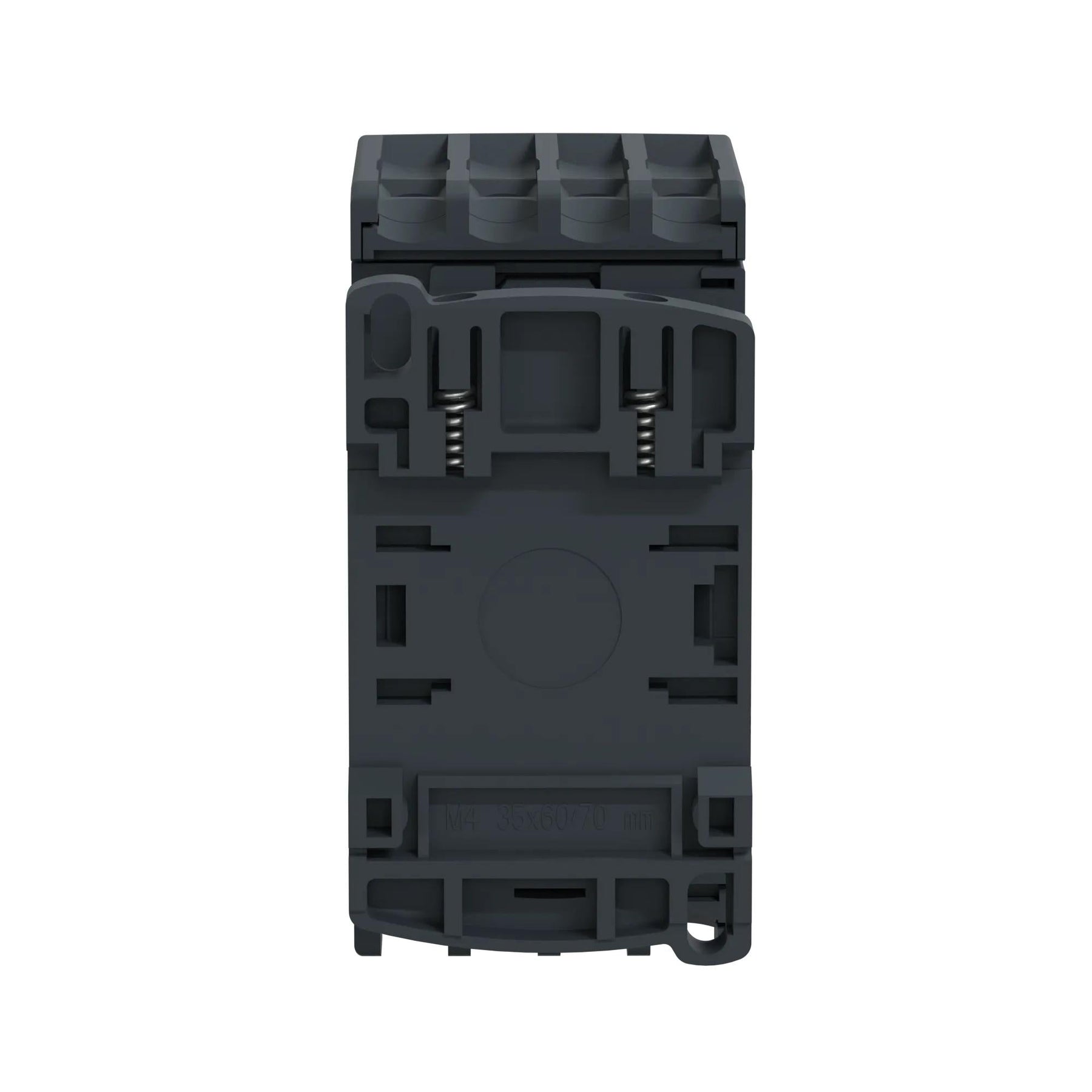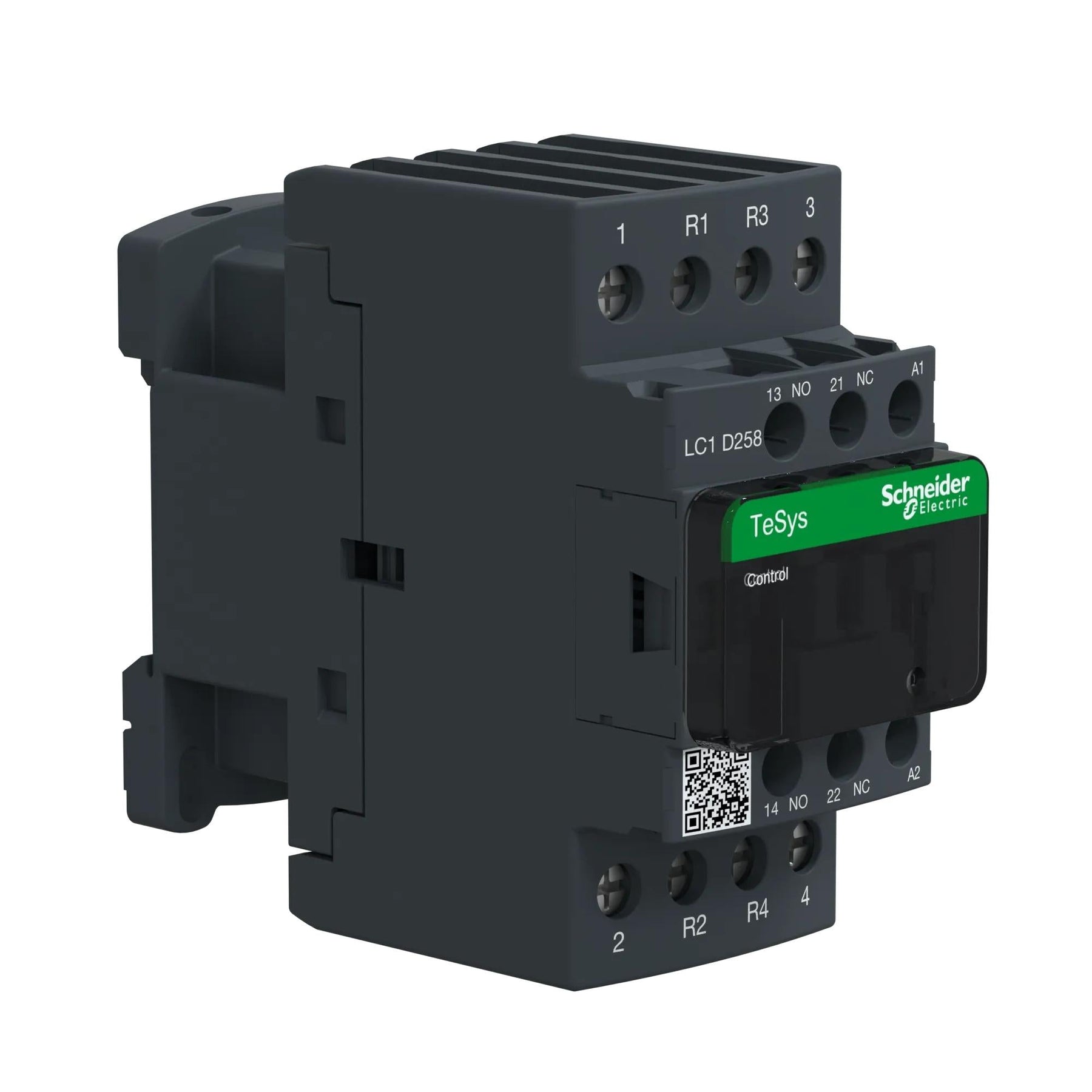TeSys D contactors have been designed for perfect integration into control systems. They can be used to create motor starters for almost any type of application. TeSys D contactors are available in 13 contactor ratings for inductive motor applications up to 150 full-load amps and resistive loads up to 200 amps. This 4 pole IEC contactor can be mounted on DIN rail or mounted directly to a panel. Contactor has two normally open and two normally closed power contacts. Power contacts have a 40A resistive load rating. Contactor is supplied with a 110 VAC 50/60 Hz coil. Contactor has one normally open and one normally closed auxiliary contact built-in as standard. The NC contact is mirror certified. Screw clamp terminals are used for load and auxiliary connections. An extensive line of accessories makes it easy to meet the requirements of most applications. The contactor is 4.13 inches tall, 1.77 inches wide and 3.90 inches deep. It weighs 0.94 lbs. Contactor is certified to UL, CSA, IEC, CCC, EAC and Marine standards. Contactor also meets the requirements of RoHS/REACh making it a Green Premium product.