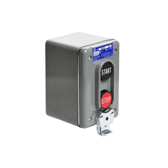 These standard duty control stations come complete with an enclosure, operators and contacts. This control station has two round momentary push buttons. It has a START push button with a normally open contact. It has a STOP push button with a normally closed contact. The STOP push button has a lockout on it. This NEMA 4 watertight and dusttight control station is surface mounted. The push button contacts are standard duty rated. The contacts have a B600 rating. That is a break rating of 360 VA for a inductive load with a 35% power factor or 5A resistive. The contacts also have a P600 rating for DC loads. Classic screw clamp connections are used to connected to control circuits. Control station is UL Listed and CSA certified.