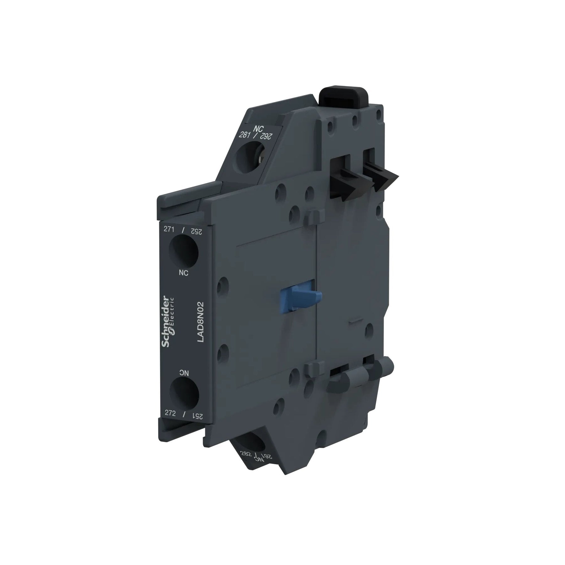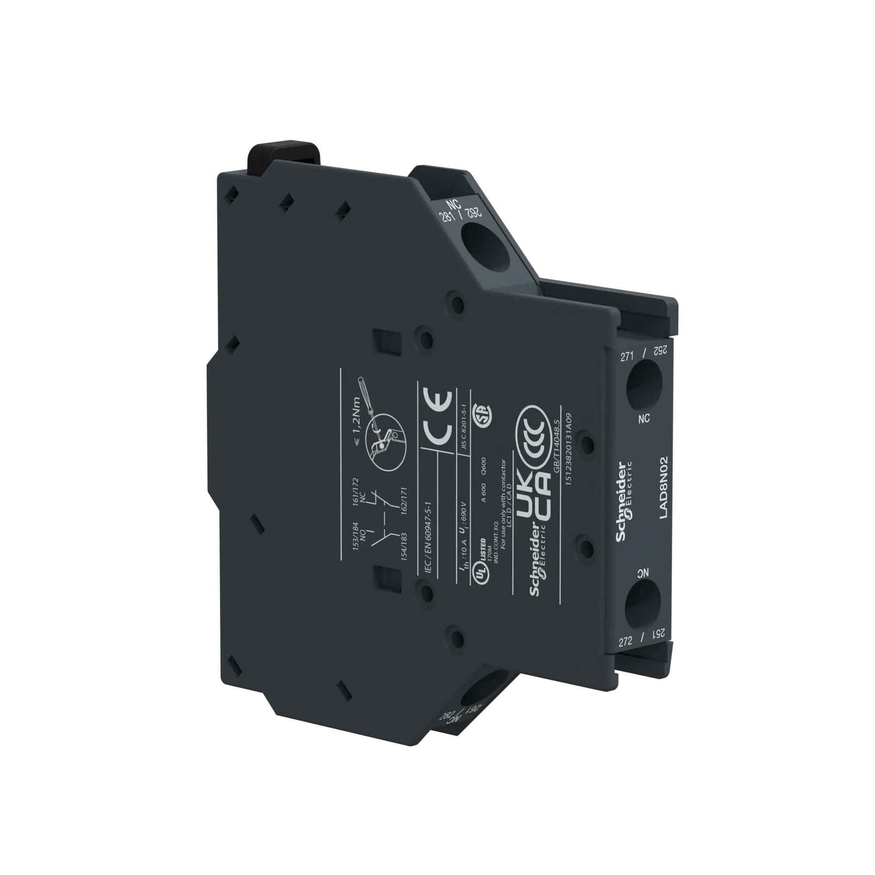 LAD8N02, Telemecanique, contactor and motor starter auxiliary, TeSys D Series, type LAD, 2NC side clip-on mount auxiliary contact, suitable for use with LC1D09-LC1D150,LP1D09-LP1D150 magnetic contactors