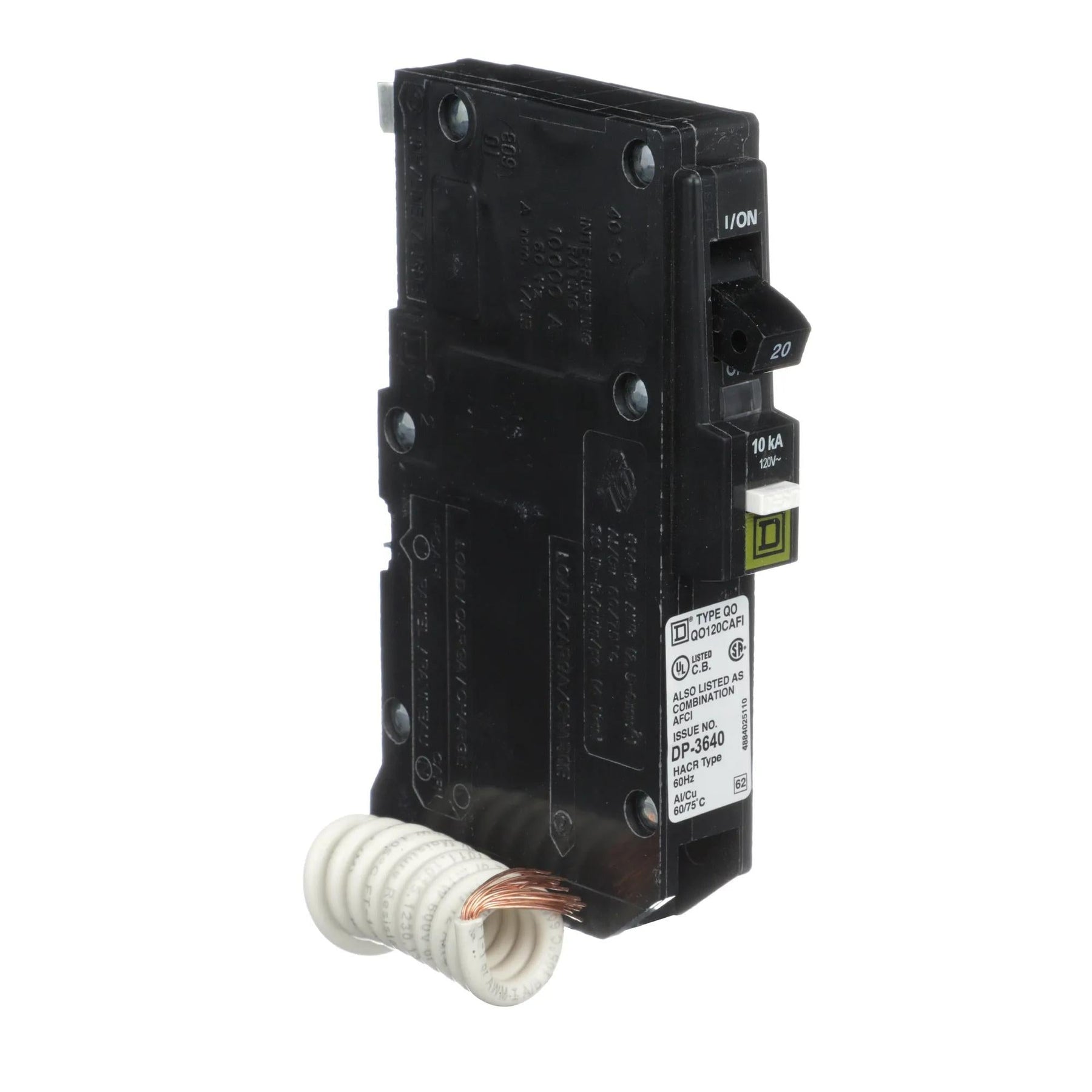 QO and QOB one, two and three pole thermal magnetic circuit breakers provide overcurrent protection and switching on ac and dc systems. These circuit breakers have an over center, trip free toggle mechanism with quick make, quick break action and positive handle indication. They also have VisiTrip trip indication, which provides a visual indication that the circuit breaker has tripped and interrupted the circuit. A full line of features and factory installed accessories are also available such as shunt trips, auxiliary switches and alarm switches. This 1 pole QO circuit breaker is rated at 20A at 120VAC. This unit provides 10kA breaking capacity and plug in mounting. This product includes a combination arc fault with pigtail. This product includes a combination arc fault with pigtail. This product is in clam packaging. QO circuit breakers are UL Listed under UL File E84967 and are CSA Certified under CSA Master Contract 153555. This product is in clam packaging.
