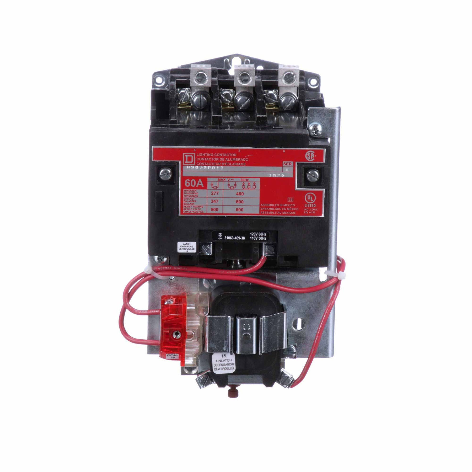 8903S lighting contactors are for lighting control applications. 8903S lighting contactors are available in either mechanically held or electrically held versions. This is a mechanically held device. This contactor is designed to switch 60 amperes. This device 2 pole device has 2 NO contacts. Supplied with a 110/120 VAC 50/60 Hz interchangeable operating coil but other coils are available in a wide variety of common voltages up to 600VAC. Contactor is an open device. A variety of enclosure types are available. Coils and contacts are easily replaced. Lighting contactor is 7.81 inches tall, 4.61 inches wide and 5.23 inches deep. 8903L lighting contactors are UL Listed and CSA Certified.