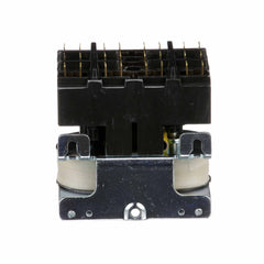 8965 reversing hoist contactors are designed for control of hoists, overhead doors, small elevators and commercial laundry equipment. They are rated to perform in the short periods of jogging experienced in hoist service. This 3 pole contactor has ratings of 1 HP at 115 VAC and 2 HP at 230 VAC single phase. Has ratings of 5 HP at 230 HP and 7.5 HP at 460 VAC and 575 VAC poly phase. These contactors must be mounted upright on the vertical plane. The contactors will not operate properly when mounted in any other position. The replaceable coil is available with a variety of coil voltages. This device has a 110/240 VAC 50/60 Hz coil. The power terminals have quick connect terminals. This device is without jumper straps. This reversing contactor doesn't have an enclosure. Reversing contactor is 3.31 inches tall, 3.31 inches wide and 3.03 inches deep. Auxiliary contacts are available for these contactors. 8965DPR reversing hoist contactors are UL component recognized and CSA certified.