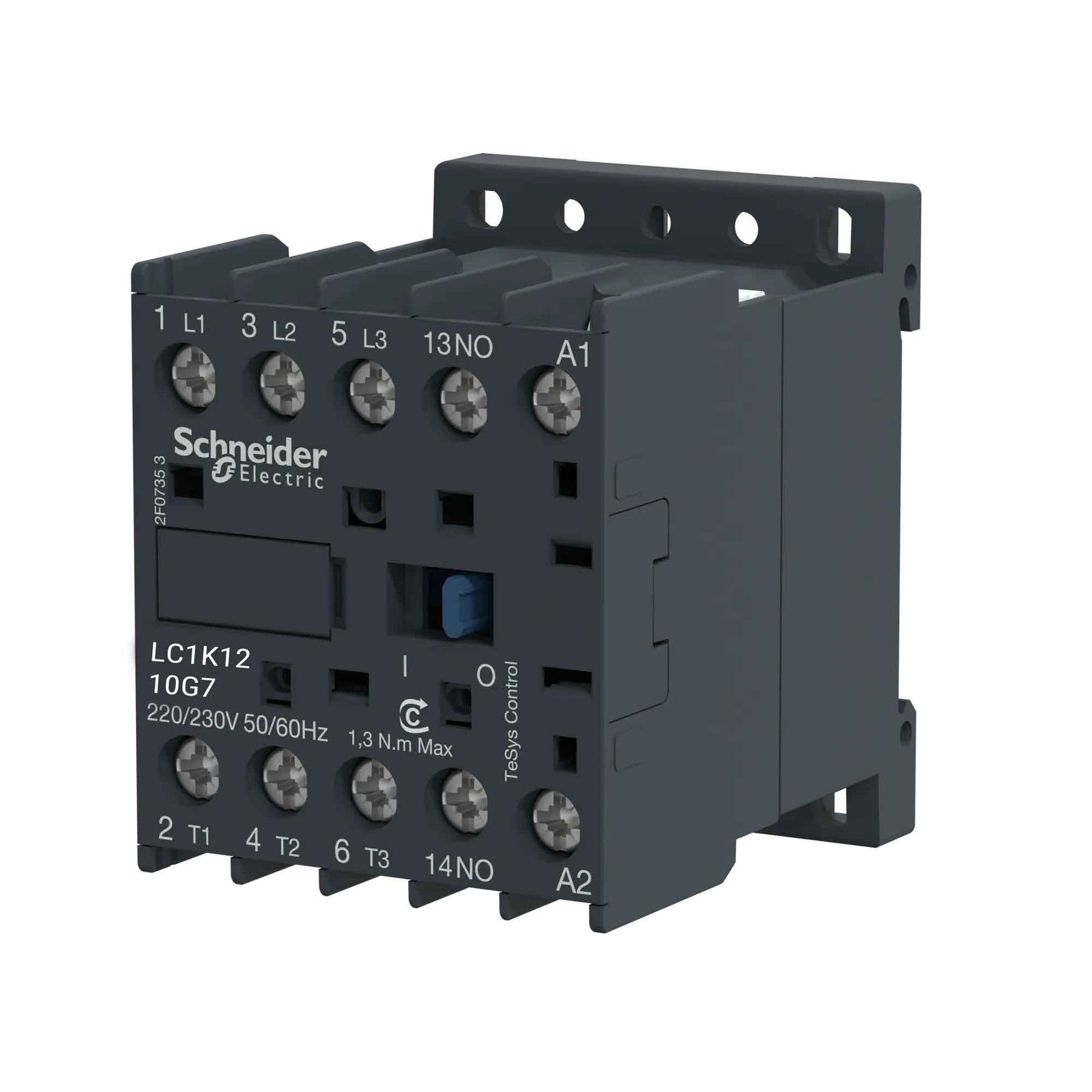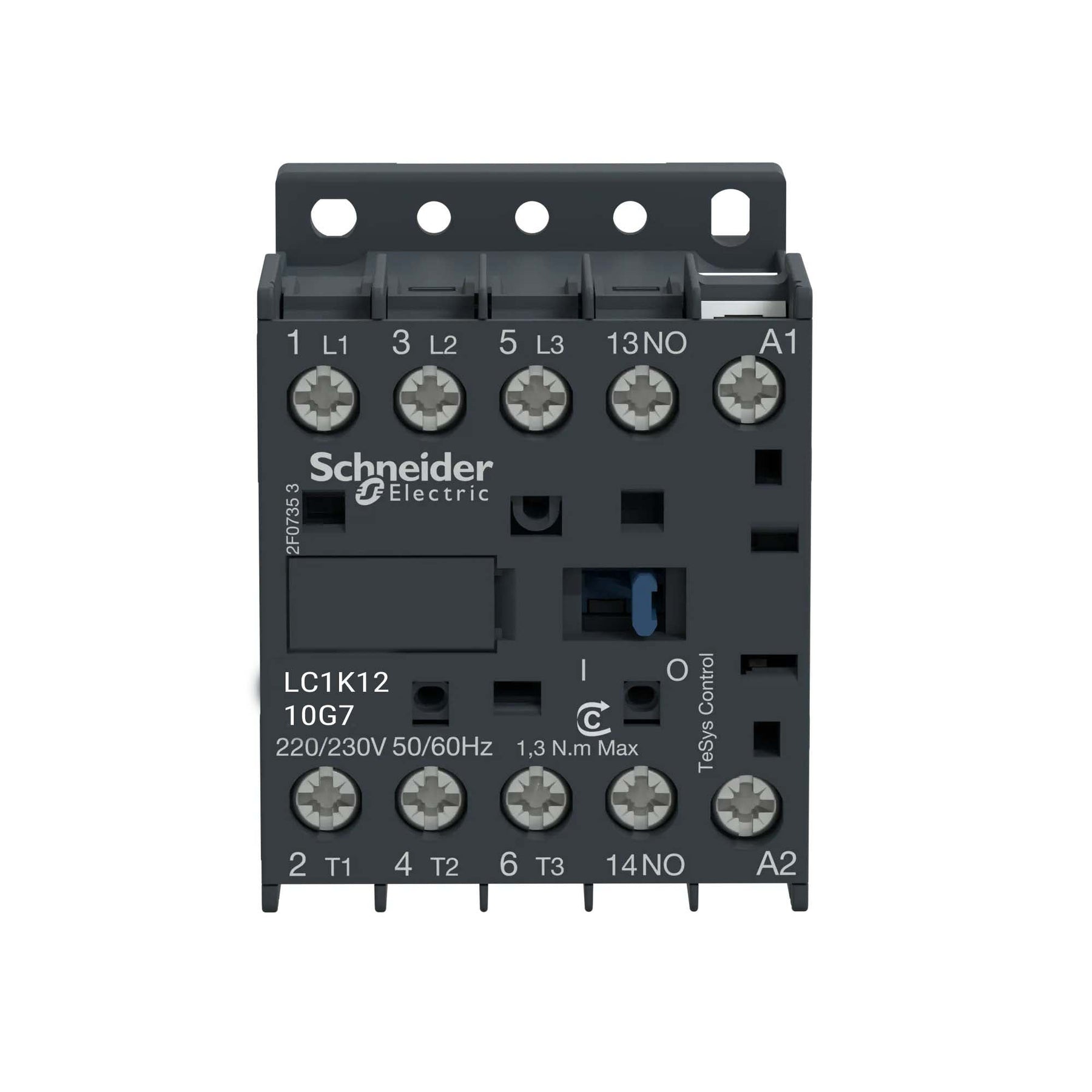 LC1K1210G7 is a compact 3-pole TeSys K contactor from Schneider Electric for motor applications. Rated 12A AC-3 5.5kW@400V, it includes a 120V 50/60Hz AC coil and 1NO auxiliary contact. LC1K1210G7 is a 3-pole TeSys K contactor from Schneider Electric for simple motor applications rated up to 5.5kW@400V. Very compact, DIN-rail compatible, with connections by screw clamp terminals, it includes a 120V 50/60Hz AC coil and 1NO built-in auxiliary contact. Available worldwide, it complies with multi-standards (IEC, UL, CSA, CCC, EAC, Marine) and is certified Green Premium (RoHs/Reach). Very compact, 45mm wide, for DIN-rail and panel mounting. Provides a control circuit compatible with 50Hz and 60Hz supplies and 1NO built-in auxiliary contact. Optimized for simple power applications. Can be completed with auxiliary contact blocks (LA1K, LA2K) and thermal relays (LR2K)