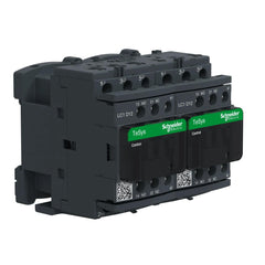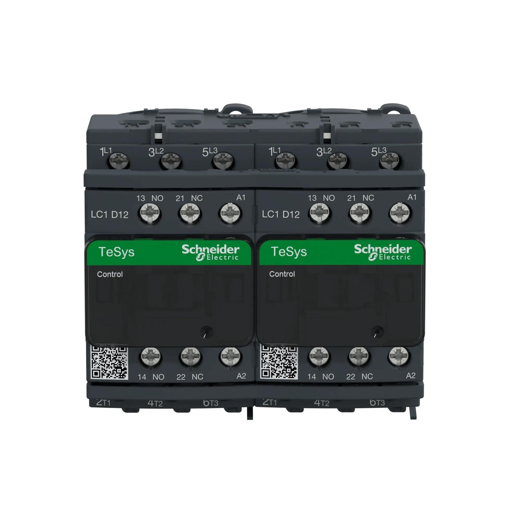 LC2D12B7 is a 3-pole TeSys D reversing contactor from Schneider Electric for motor applications. Rated 12A AC-3 5.5kW@400V, it includes a 24V 50/60Hz AC coil, 2NO+2NC aux contacts, a mechanical interlock. LC2D12B7 is a 3-pole TeSys D reversing contactor from Schneider Electric for motor applications up to 5.5kW@400V. It includes a 24V 50/60Hz AC coil and 2NO+2NC built-in auxiliary contacts, NC mirror certified. Compact, DIN-rail mounting, with mechanical interlock and pre-wired reversing circuit, it procures reliability and durability. Available worldwide, it is multi-standards certified (IEC, UL, CSA, CCC, EAC, Marine) and Green Premium compliant (RoHs/Reach). Compact product, 90mm wide, for DIN-rail and panel mounting. Assembled with mechanical interlock and pre-wired reversing circuit. Clear separation between power and control circuits, easy front access to coil and auxiliary contacts connections. Equipped with a 24V AC coil that can be supplied at 50Hz or 60Hz. Provides 4 built-in auxiliary contacts 2NO + 2NC, NC contacts are mirror certified suitable to be included in the control of safety systems. High electrical durability, guaranteed for 2 million cycles at 12A AC-3 440V, for demanding motor switching applications. Robust design with high making and breaking capacities up to 20 In. Connection by screw clamp terminals.