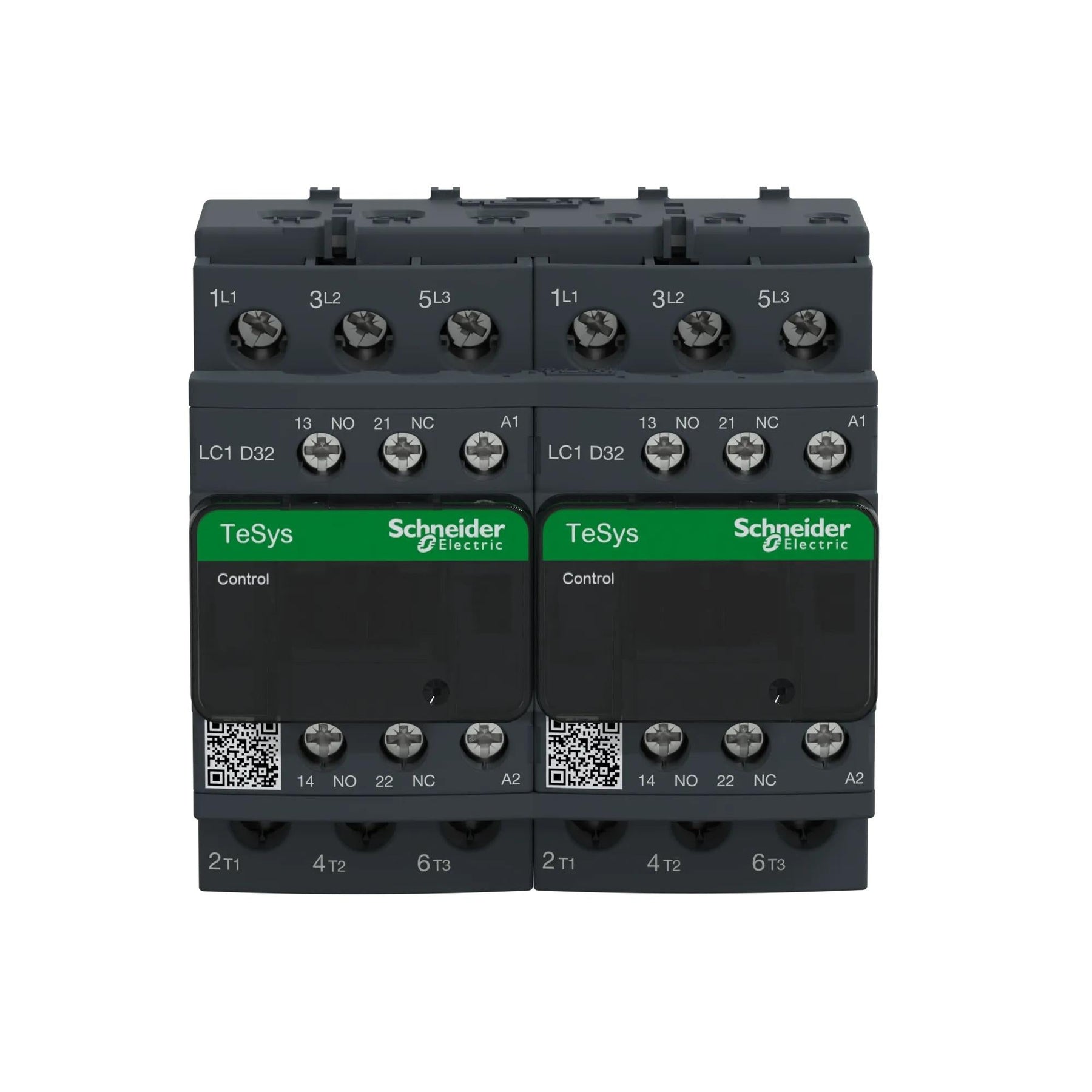 LC2D32B7 is a 3-pole TeSys D reversing contactor from Schneider Electric for motor applications. Rated 32A AC-3 15kW@400V, it includes a 24V 50/60Hz AC coil, 2NO+2NC aux contacts, a mechanical interlock. LC2D32B7 is a 3-pole TeSys D reversing contactor from Schneider Electric for motor applications up to 15kW@400V. It includes a 24V 50/60Hz AC coil and 2NO+2NC built-in auxiliary contacts, NC mirror certified. Compact, DIN-rail mounting, with mechanical interlock and pre-wired reversing circuit, it procures reliability and durability. Available worldwide, it is multi-standards certified (IEC, UL, CSA, CCC, EAC, Marine) and Green Premium compliant (RoHs/Reach). Compact product, 90mm wide, for DIN-rail and panel mounting. Assembled with mechanical interlock and pre-wired reversing circuit. Clear separation between power and control circuits, easy front access to coil and auxiliary contacts connections. Equipped with a 24V AC coil that can be supplied at 50Hz or 60Hz. Provides 4 built-in auxiliary contacts 2NO + 2NC, NC contacts are mirror certified suitable to be included in the control of safety systems. High electrical durability, guaranteed for 2 million cycles at 32A AC-3 440V, for demanding motor switching applications. Robust design with high making and breaking capacities up to 20 In. Connection by screw clamp terminals.