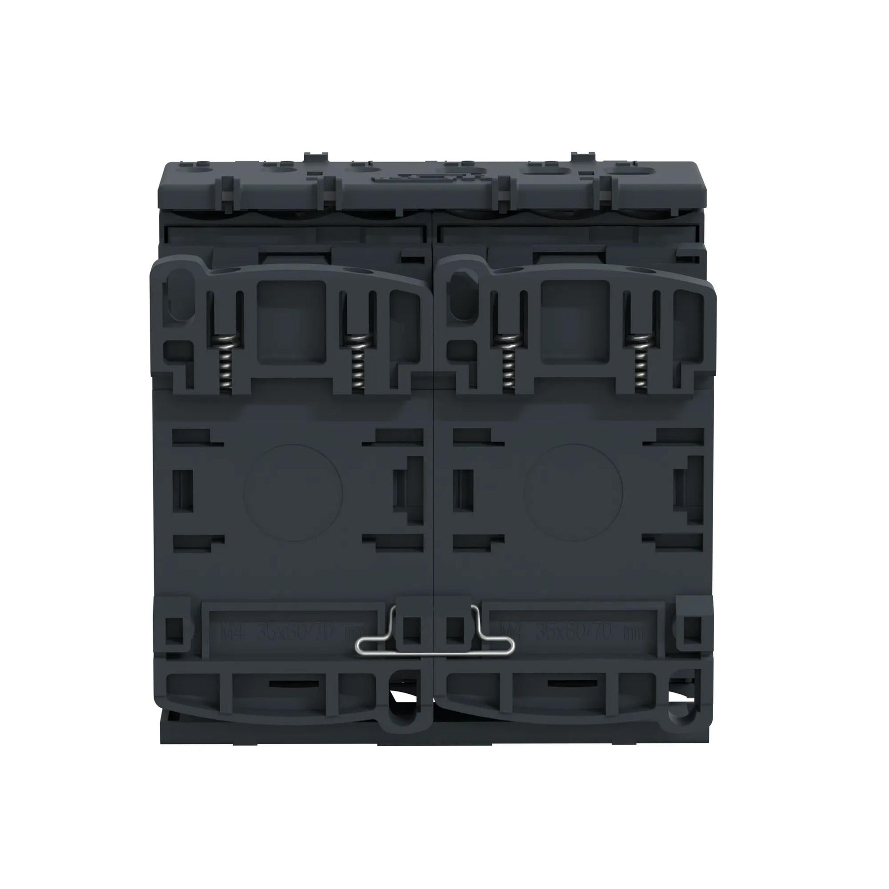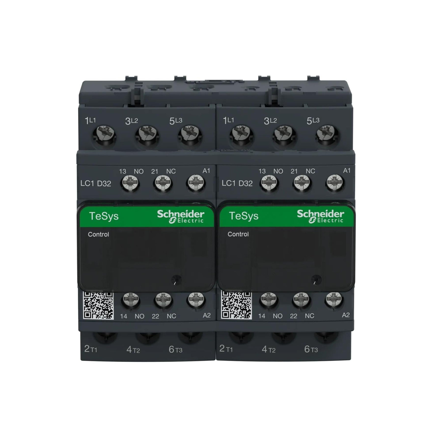 LC2D32E7 is a 3-pole TeSys D reversing contactor from Schneider Electric for motor applications. Rated 32A AC-3 15kW@400V, it includes a 48V 50/60Hz AC coil, 2NO+2NC aux contacts, a mechanical interlock. LC2D32E7 is a 3-pole TeSys D reversing contactor from Schneider Electric for motor applications up to 15kW@400V. It includes a 48V 50/60Hz AC coil and 2NO+2NC built-in auxiliary contacts, NC mirror certified. Compact, DIN-rail mounting, with mechanical interlock and pre-wired reversing circuit, it procures reliability and durability. Available worldwide, it is multi-standards certified (IEC, UL, CSA, CCC, EAC, Marine) and Green Premium compliant (RoHs/Reach). Compact product, 90mm wide, for DIN-rail and panel mounting. Assembled with mechanical interlock and pre-wired reversing circuit. Clear separation between power and control circuits, easy front access to coil and auxiliary contacts connections. Equipped with a 48V AC coil that can be supplied at 50Hz or 60Hz. Provides 4 built-in auxiliary contacts 2NO + 2NC, NC contacts are mirror certified suitable to be included in the control of safety systems. High electrical durability, guaranteed for 2 million cycles at 32A AC-3 440V, for demanding motor switching applications. Robust design with high making and breaking capacities up to 20 In. Connection by screw clamp terminals.