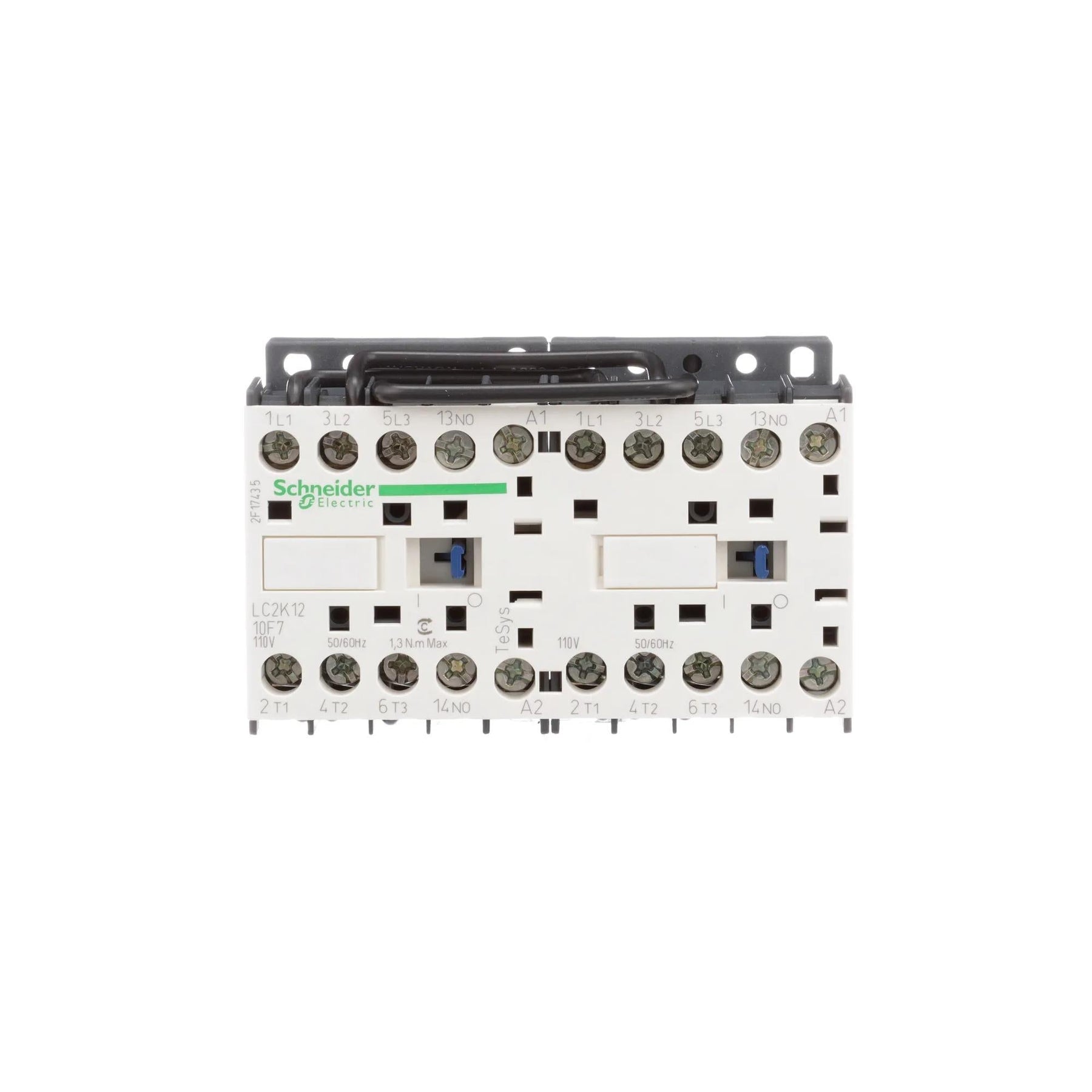 LC2K1210F7 is a compact 3-pole TeSys K reversing contactor from Schneider Electric for motor applications. Rated 12A AC-3 5.5kW@400V, it includes a 110V 50/60Hz AC coil, 2NO auxiliary contacts, a mechanical interlock and pre-wired reversing circuit. LC2K1210F7 is a 3-pole TeSys K reversing contactor from Schneider Electric for simple motor applications rated up to 5.5kW@400V. Very compact, DIN-rail compatible, with connections by screw clamp terminals, it is assembled with a mechanical interlock and a pre-wired reversing circuit. It includes a 110V 50/60Hz AC coil and 2NO built-in auxiliary contacts. Available worldwide, it complies with multi-standards (IEC, UL, CSA, CCC, EAC, Marine) and is certified Green Premium (RoHs/Reach). Very compact, 90mm wide, for DIN-rail and panel mounting. Assembled with mechanical interlock and pre-wired reversing circuit. Provides a 110V AC coil compatible 50/60Hz and 2NO built-in auxiliary contact. Can be completed with auxiliary contact blocks (LA1K, LA2K) and thermal relays (LR2K).