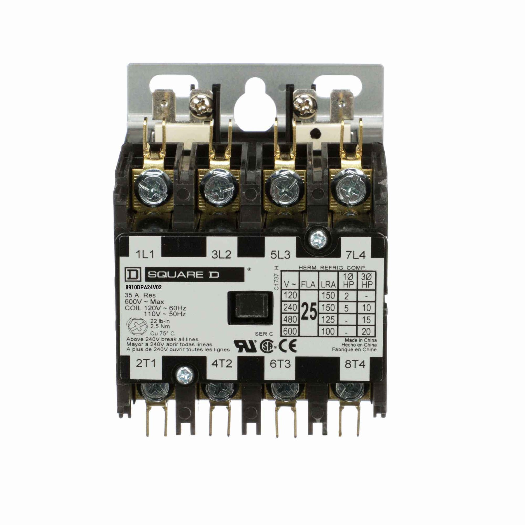 8910DPA24V02, Square D, Class 8910, type DPA, definite purpose contactor, 7.5HP @ 230V, 10HP @ 460/575V, 4P, 3PH, 25A, 600V, complete with 120V coil