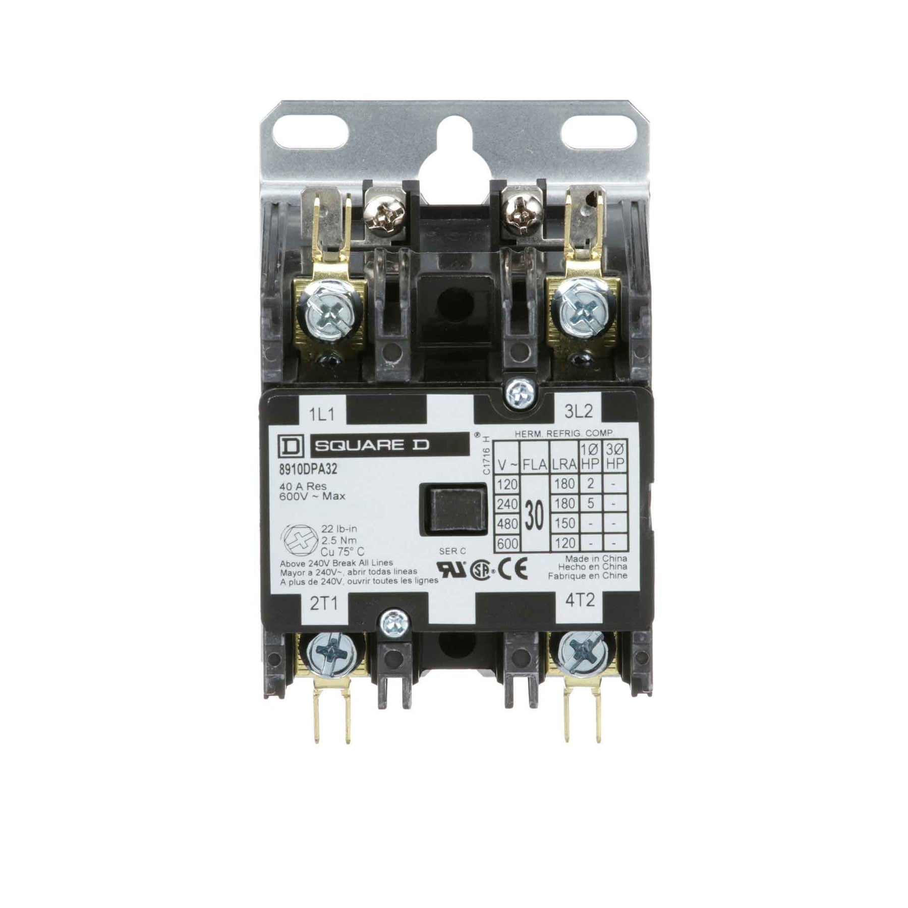 8910DPA32V04, Square D, Class 8910, type DPA, definite purpose contactor, 10HP @ 230V, 15HP @ 460/575V, 2P, 1PH, 30A, 600V, complete with 277V coil