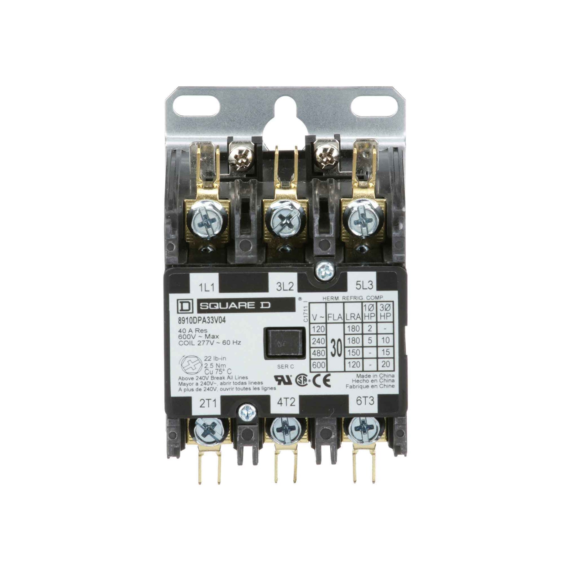 8910DPA33V04, Square D, Class 8910, type DPA, definite purpose contactor, 10HP @ 230V, 15HP @ 460/575V, 3P, 3PH, 30A, 600V, complete with 277V coil