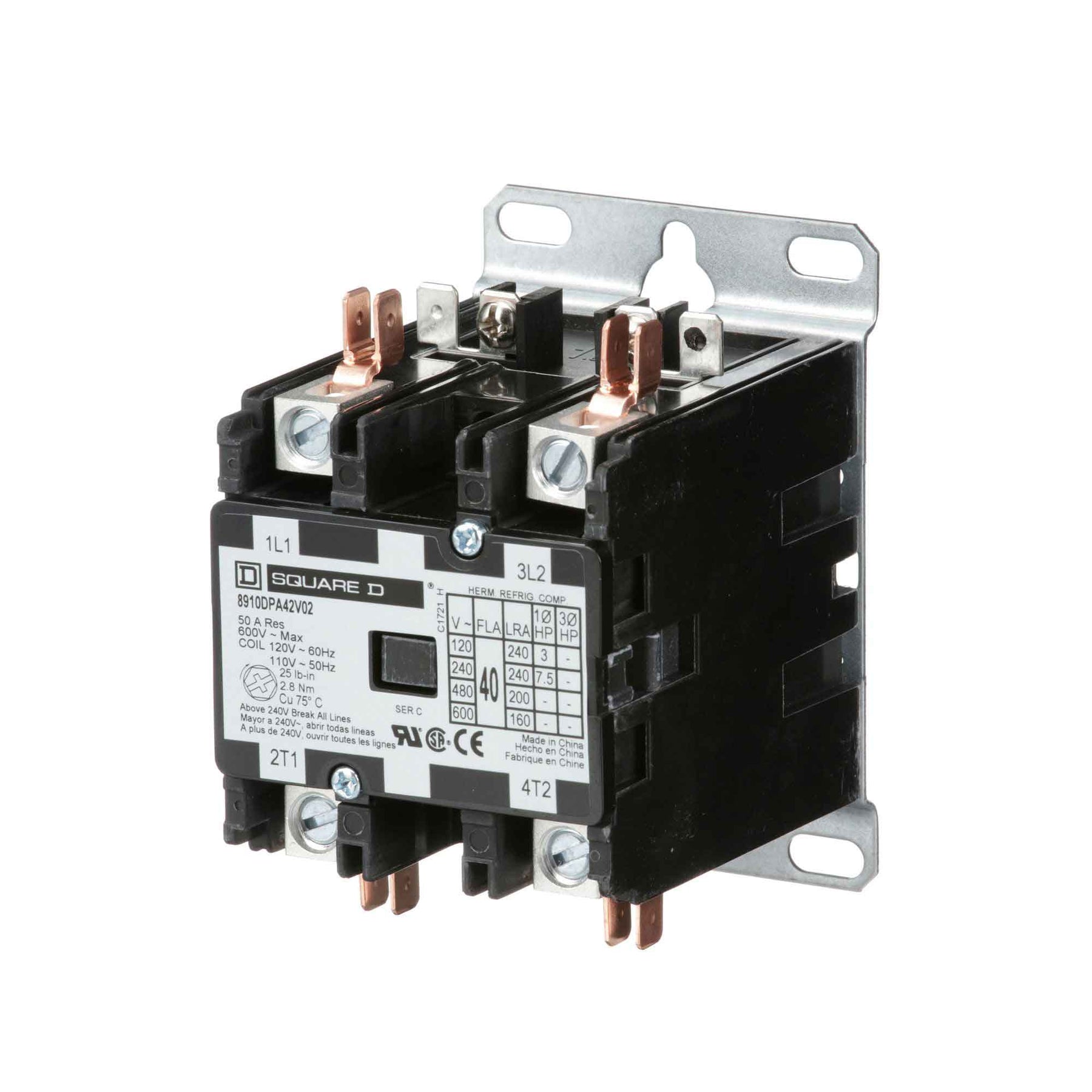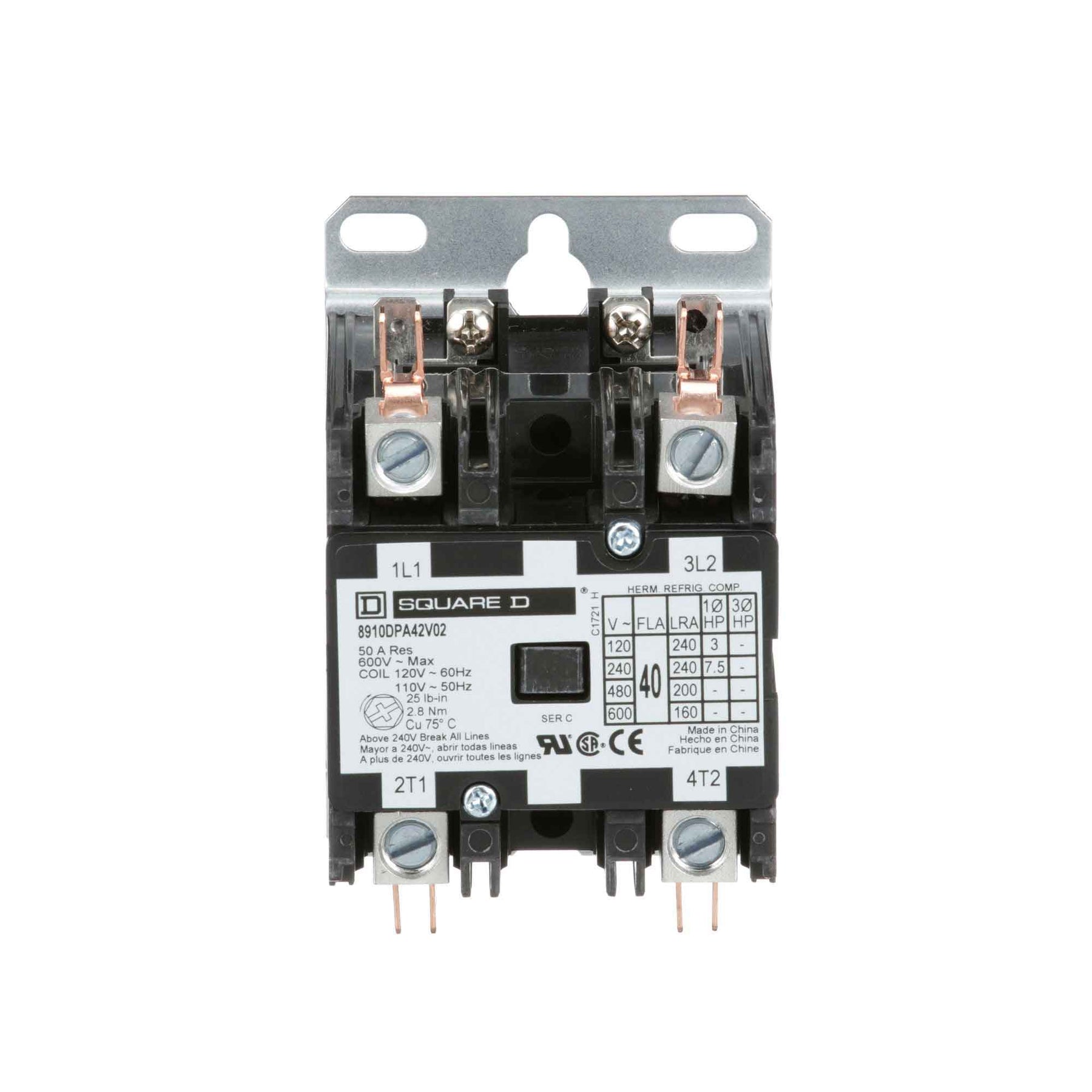 8910DPA42V02, Square D, Class 8910, type DPA, definite purpose contactor, 10HP @ 230V, 20HP @ 460/575V, 2P, 1PH, 40A, 600V, complete with 120V coil