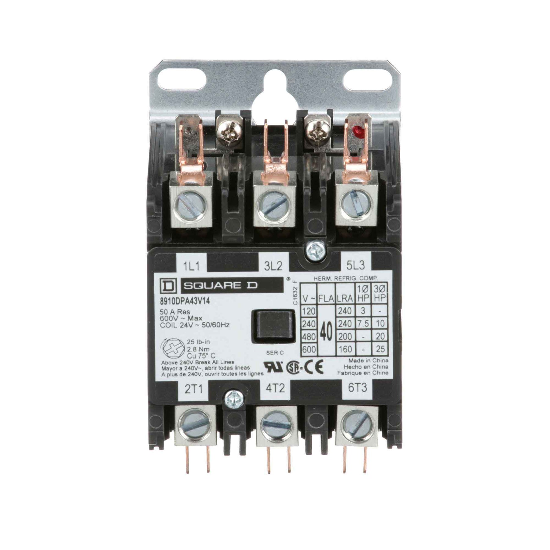 8910DPA43V14, Square D, Class 8910, type DPA, definite purpose contactor, 10HP @ 230V, 20HP @ 460/575V, 3P, 3PH, 40A, 600V, complete with 24V coil