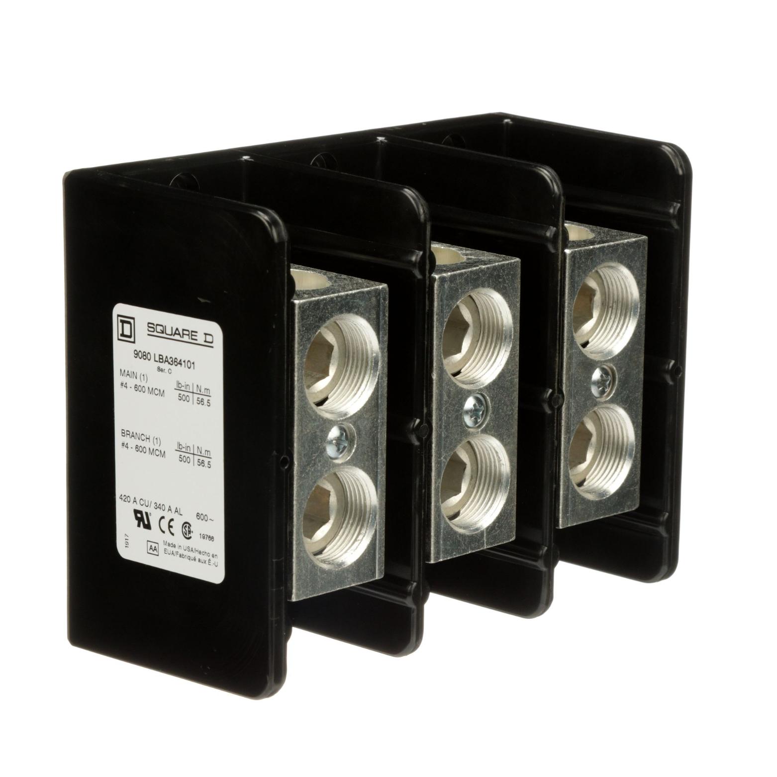Linergy power distribution blocks are for terminating wires and are designed to NEMA standards. This three pole block has one lug opening on the line (main) side and one lug opening on the load (branch) side. The line side lug is rated to accept one #4 to 600 kcmil copper or aluminum wire. The load side lug is rated to accept one #4 to 600 kcmil copper or aluminum wire. The lugs are made of aluminum. The lugs are rated for 420 amperes with copper wire and 340 amperes with aluminum wire. The lugs are rated to 600 volts. The housing is made of general purpose phenolic. These Linergy power distribution blocks are UL component recognized and CSA certified.