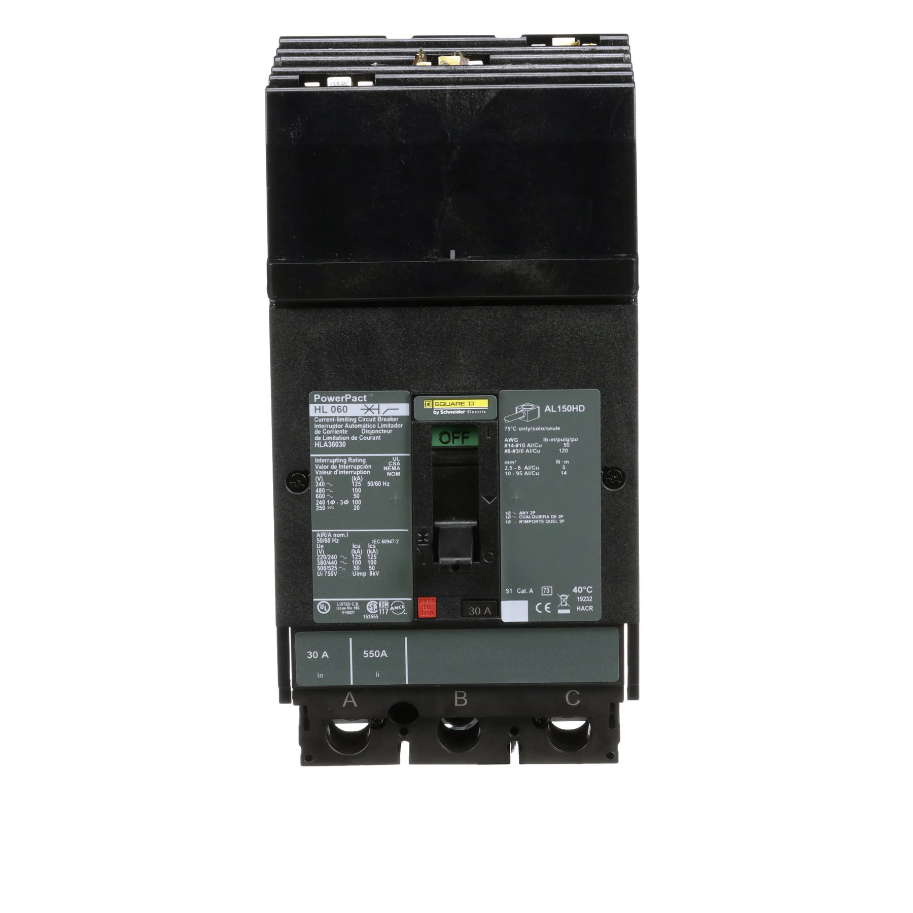 Square D, Powerpact, type HLA, 3PH, 3P, ABC phase connection, 30A, 600V, 100kA@480V, current limiting, i-line style plug-in, UL listed, suitable for reverse fed applications, complete with non-interchangeable trip, LI - Long-Time and Instantaneous trip functions, thermal magnetic, molded case circuit breakers
