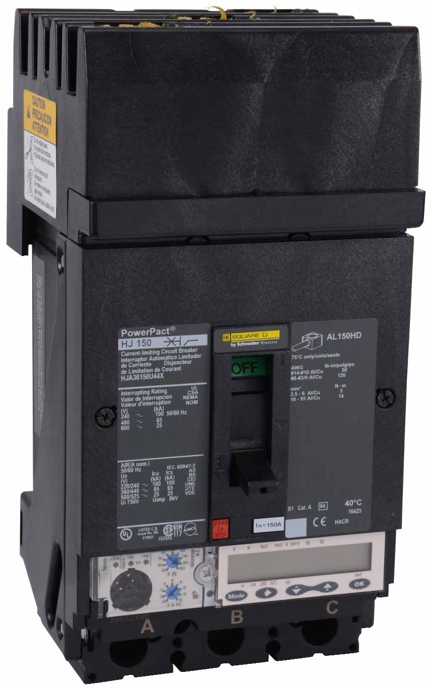 Square D, Powerpact, type HJA, 3P, ABC phase connection, 3PH, 150A, 600V, 65kA@480V, i-line style plug-in, UL listed, suitable for reverse connection, LSIG - Long-Time, Short-Time, Instantaneous and Ground Fault trip functions, solid state electronic
