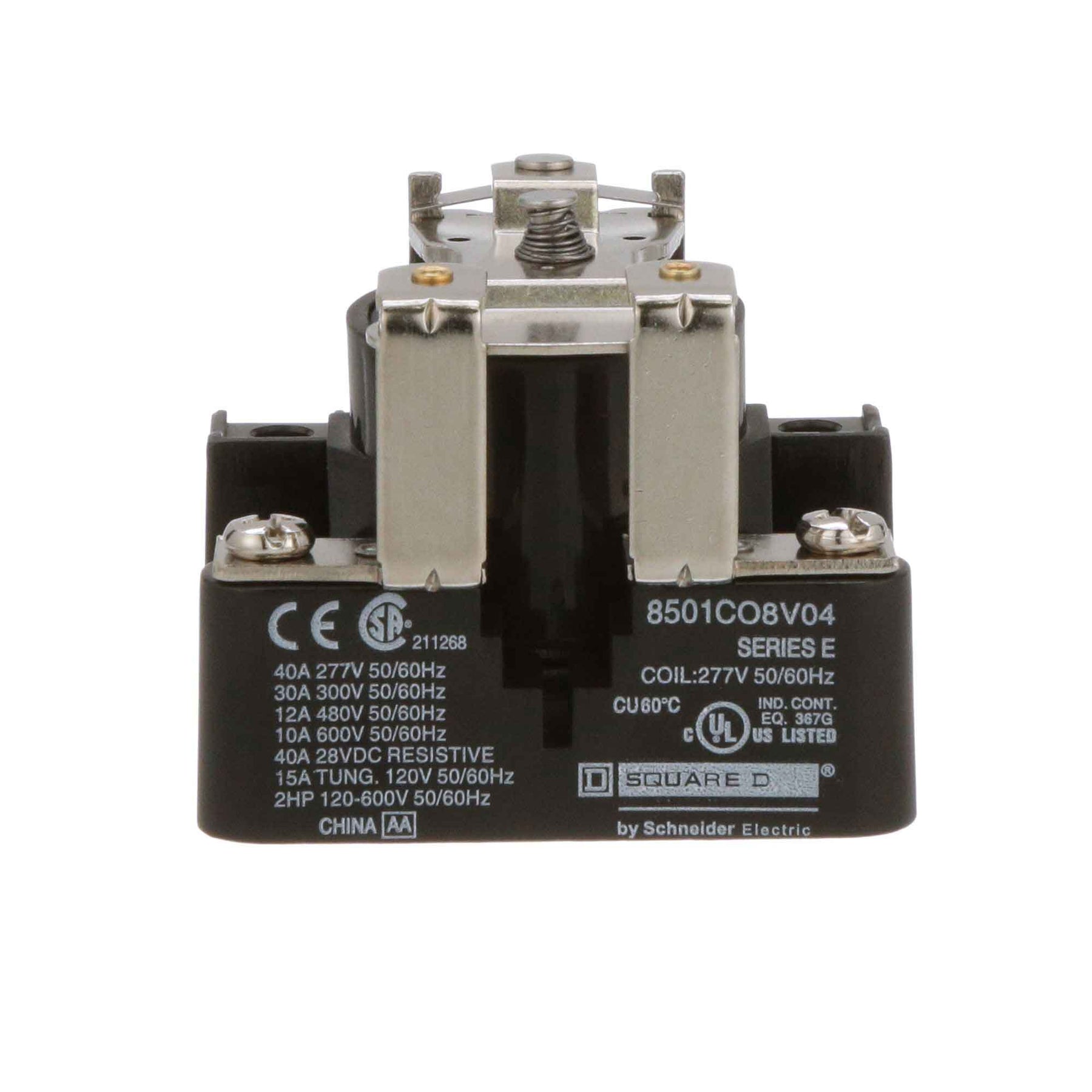 8501CO8V04, Square D, Class 8501, motor control part and accessory, Relays, type C, UL listed, CSA certified, 1 N.C. Fixed contacts, complete with 277 VAC 50/60Hz standard coil, 300V/600V, 30A @ 300Vac, 10A @ 600Vac, suitable for use with Class 8501 motor control systems