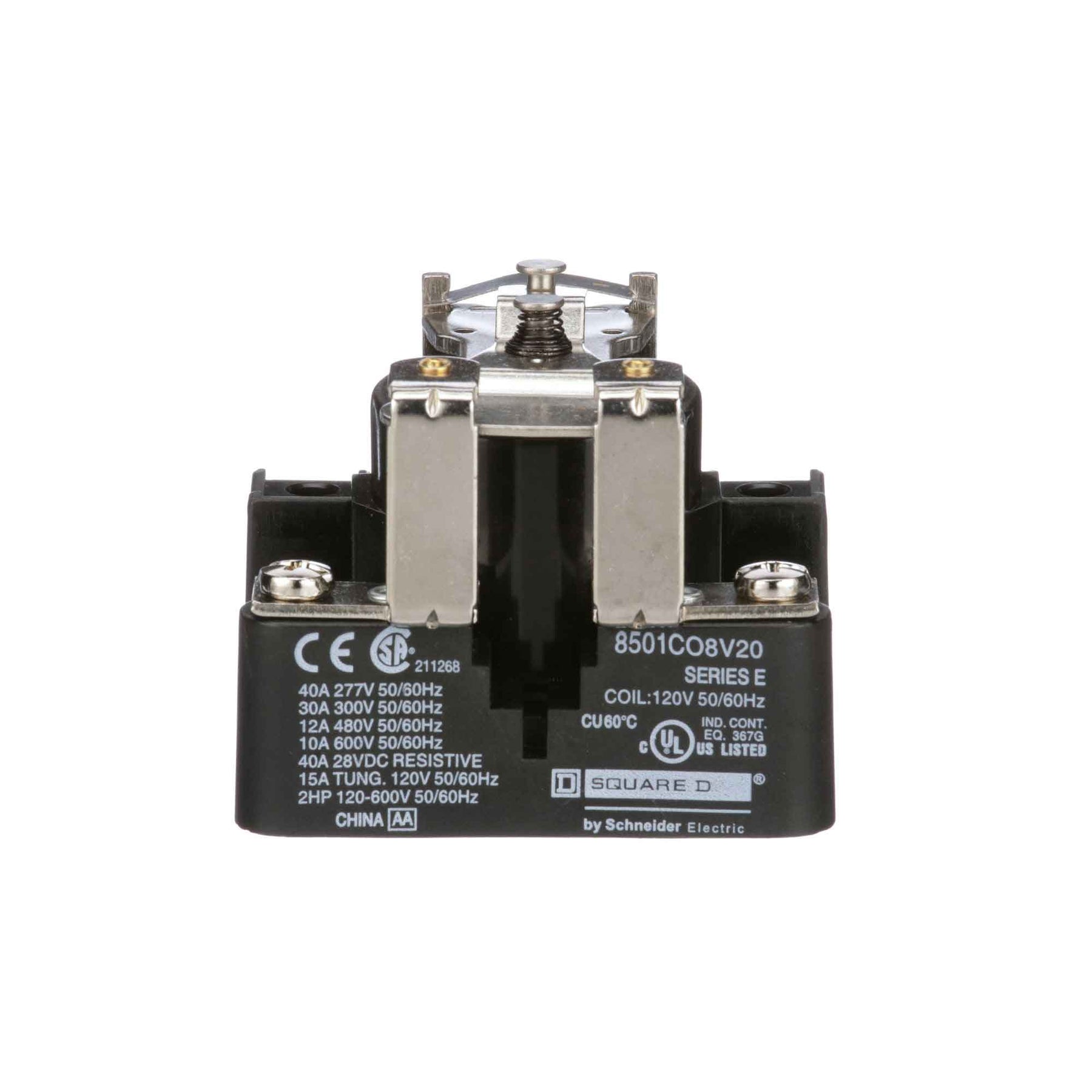 8501CO8V20, Square D, Class 8501, motor control part and accessory, Relays, type C, UL listed, CSA certified, 1 N.C. Fixed contacts, complete with 120 VAC 50/60Hz standard coil, 300V/600V, 30A @ 300Vac, 10A @ 600Vac, suitable for use with Class 8501 motor control systems