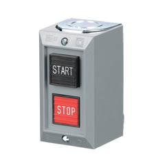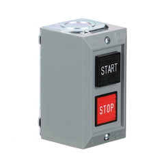 These standard duty control stations come complete with an enclosure, operators and contacts. This control station has two square momentary push buttons. It has a START push button with a normally open contact and a STOP push button with a normally closed contact. This control station has maintained contacts. This NEMA 1 general purpose control station is surface mounted. The push button contacts are standard duty rated. The contacts have a B600 rating. That is a break rating of 360 VA for a inductive load with a 35% power factor or 5A resistive. The contacts also have a P600 rating for DC loads. Classic screw clamp connections are used to connected to control circuits. Control station is UL Listed and CSA certified.