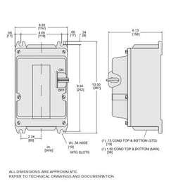 2510M and T integral horsepower manual motor starters provide overload protection and On Off control for small AC motors. These non-reversing integral horsepower manual starters are used in a variety of industrial and commercial installations. Typical applications include fans, conveyors, pumps, and small machine tools. This NEMA Size M-0 three pole starter is rated for 3 HP at 200-230 VAC and 5 HP at 380-575 VAC three phase. Three melting alloy thermal units are used with this manual starter to sense over current conditions. These thermal units are ordered separately to match motor data. A cast aluminum NEMA 7 and 9 hazardous location, Class 1, Groups C & D and Class II, Groups E, F, & G enclosure is used to protect this starter. This enclosure has one 0.75 inch conduit entry on the bottom and one on the top. Enclosure is 10.50 inches tall, 6.00 inches wide and 6.13 inches deep. A toggle handle is used to turn the manual switch on and off. The toggle handle can be padlocked in the off or stop position. 2510M integral horsepower starters are UL listed and CSA certified. The toggle handle can be padlocked in the off or stop position. 2510M integral horsepower starters are UL listed and CSA certified.