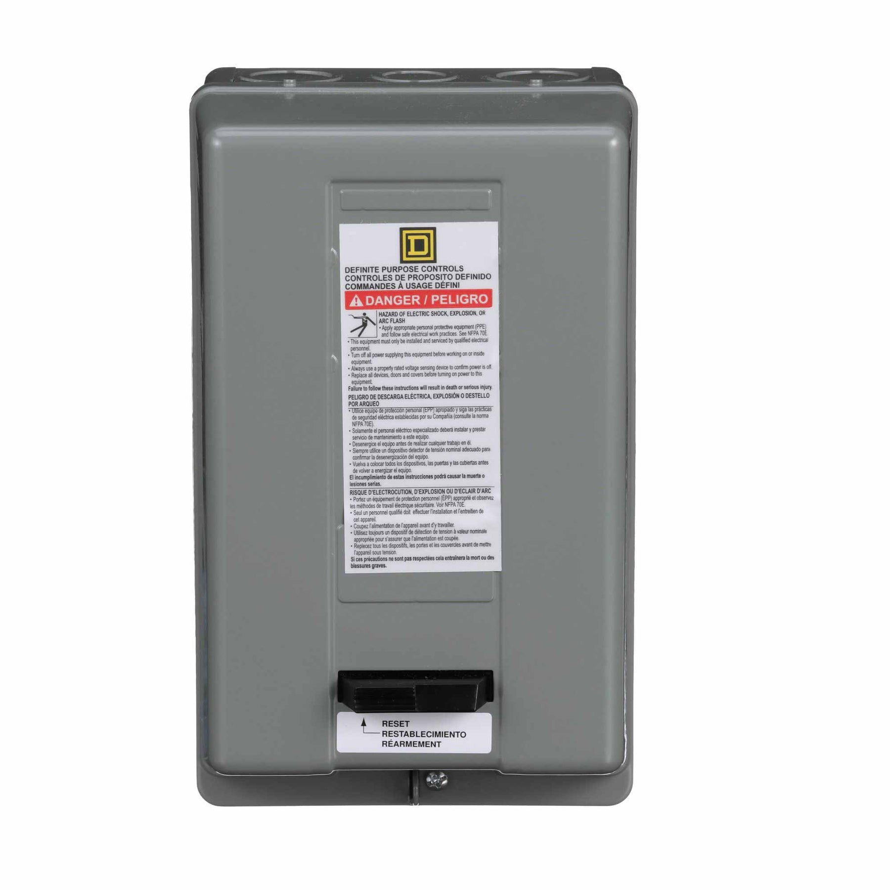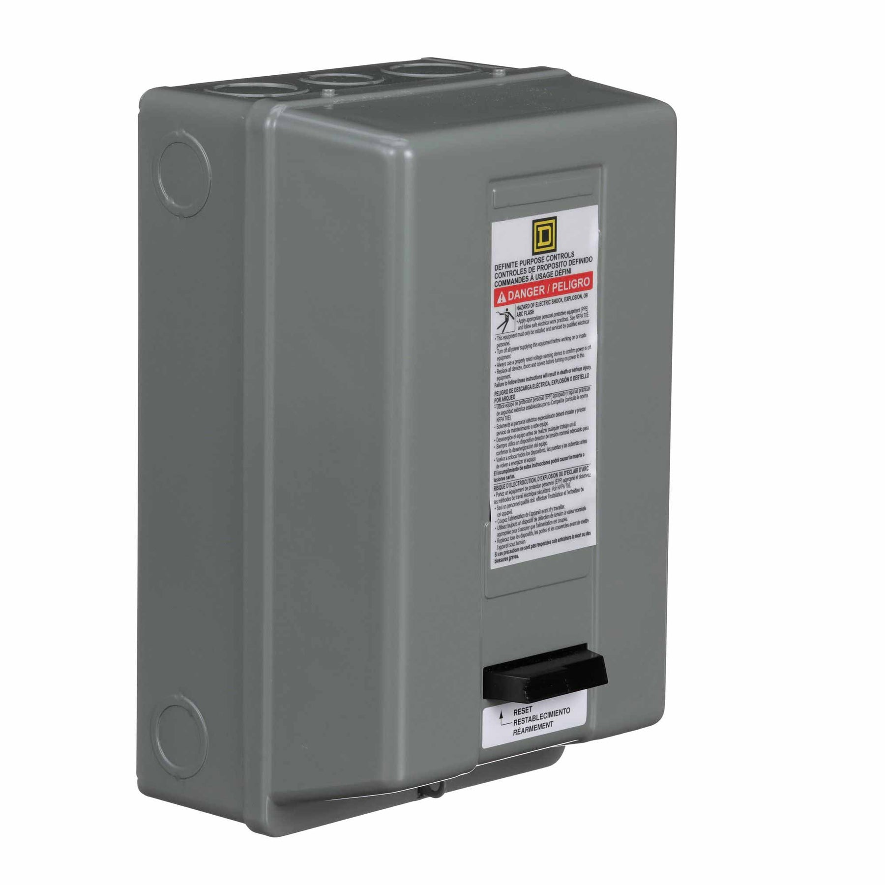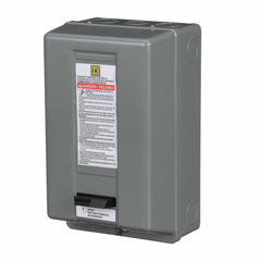 8911 definite purpose starters are inexpensive starters for applications with relatively low duty cycles. Typical applications include air compressors, agricultural equipment, pumps, and HVAC equipment. This two pole definite purpose starter has a full load rating of 40 amperes. This starter has ratings of 3 HP at 115 VAC and 7.5 HP at 230 VAC single phase. The nonreplaceable coil is available with a variety of coil voltages. This device has a 220/208 to 240 VAC 50/60 Hz coil. The starter has straight through wiring. The melting alloy type overload relay uses Type B thermal units to sense over current conditions. A painted sheet steel NEMA 1 general purpose enclosure is used to protect this definite purpose starter. Enclosure is 8.50 inches tall, 4.84 inches wide and 4.02 inches deep. Auxiliary contacts are available for these starters. 8911DPS definite purpose starters are UL component recognized.