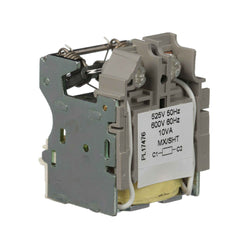 Shunt trip accessory for Schneider Electric Powerpact Type S circuit breakers with a voltage rating of /600VAC. The suffix code is SJ, and it is suitable for use with various molded case circuit breaker frame types: DG, DJ, DL, HD, HG, HJ, HL, HR, JD, JG, JJ, JL, JR, LD, LG, LJ, LL, LR.